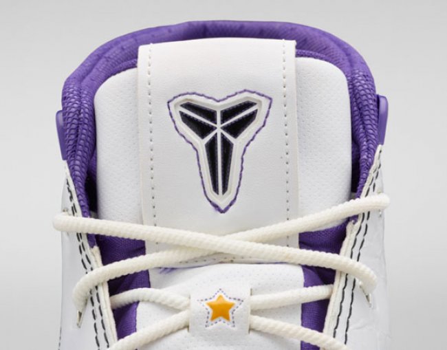 这双 Nike Zoom Kobe 1 PE 以白色鞋身搭配黑色 Swoosh,细节以紫色和黄色注入,带来湖人队氛围。