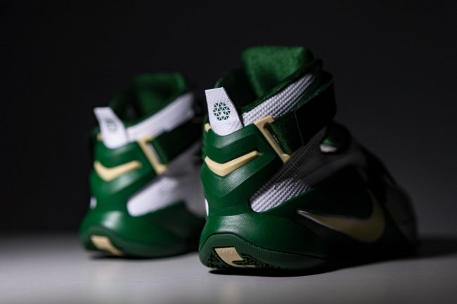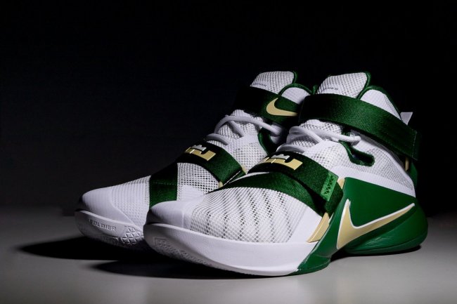 圣文森特-圣玛丽高中配色再现 LeBron 球鞋,此番登陆 Soldier 9 士兵九代,带来熟悉的 SVSM 装扮。 Nike Zoom LeBron Soldier 9 “SVSM” 以主客场装扮带来一白一绿两款配色,熟悉而精致的詹姆斯高中配色完美呈现,也是众多 LeBron 球鞋收藏爱好者所不容错过的精品佳作。