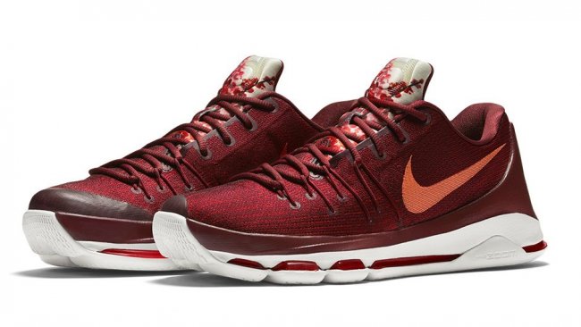 杜兰特战靴迎来新色发售,此番以颇具中国文化的腊梅主题呈现。 眼前这款 KD 8 “Perseverance” 以腊梅在寒冬中的傲然挺立为灵感来源打造,以团队红编织鞋身搭配白色的鞋底,颇具中国国画风格的鞋舌腊梅图纹,则直接契合主题,带来细腻而精致的中国传统文化艺术感受。 将于 2 月 6 日正式发售,发售价为 ¥1299 RMB,届时将登陆 Nike.com。 货号:800259-661 发售日期:2 月 6 日 发售价:¥1299