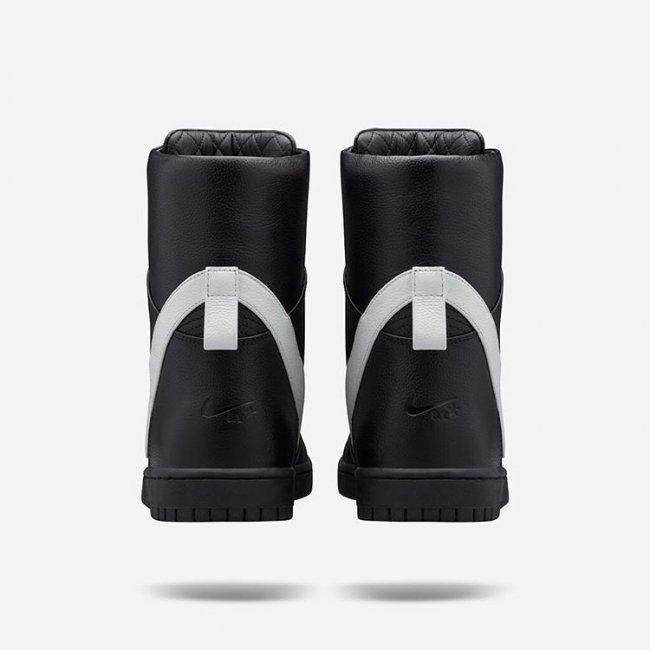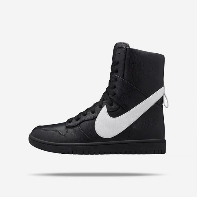 选用了 Nike Dunk 鞋型为蓝本,R.T. 颇为心仪这款既主流又小众的经典鞋型。Ricardo Tisci x NikeLab Dunk Lux High 以超高帮的外观带来十足的潮流气息,而首发配色以黑色鞋身点缀硕大的白色 Swoosh,简约明快的反差点缀也颇具亮点。