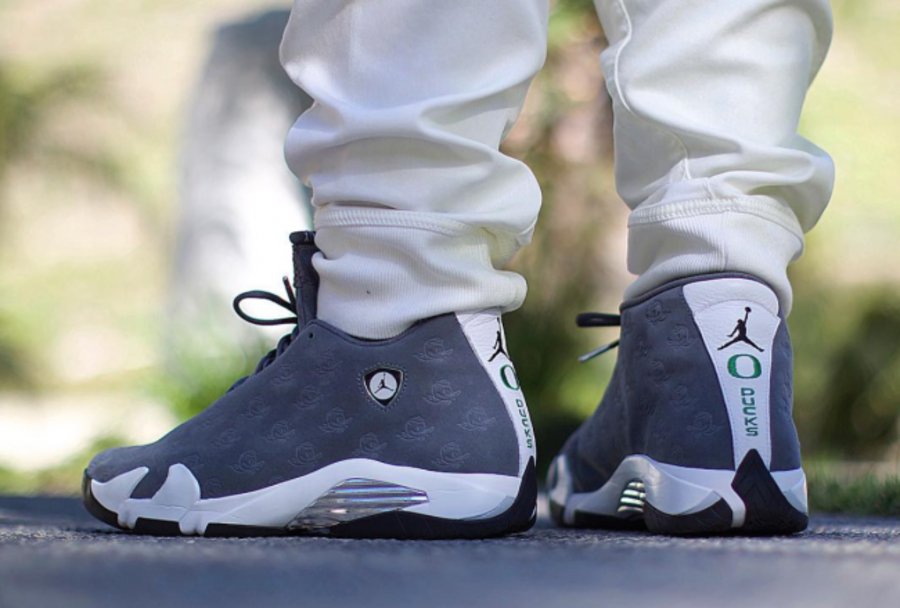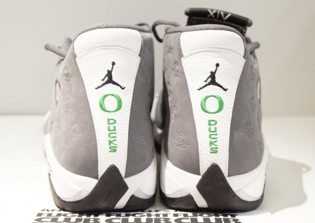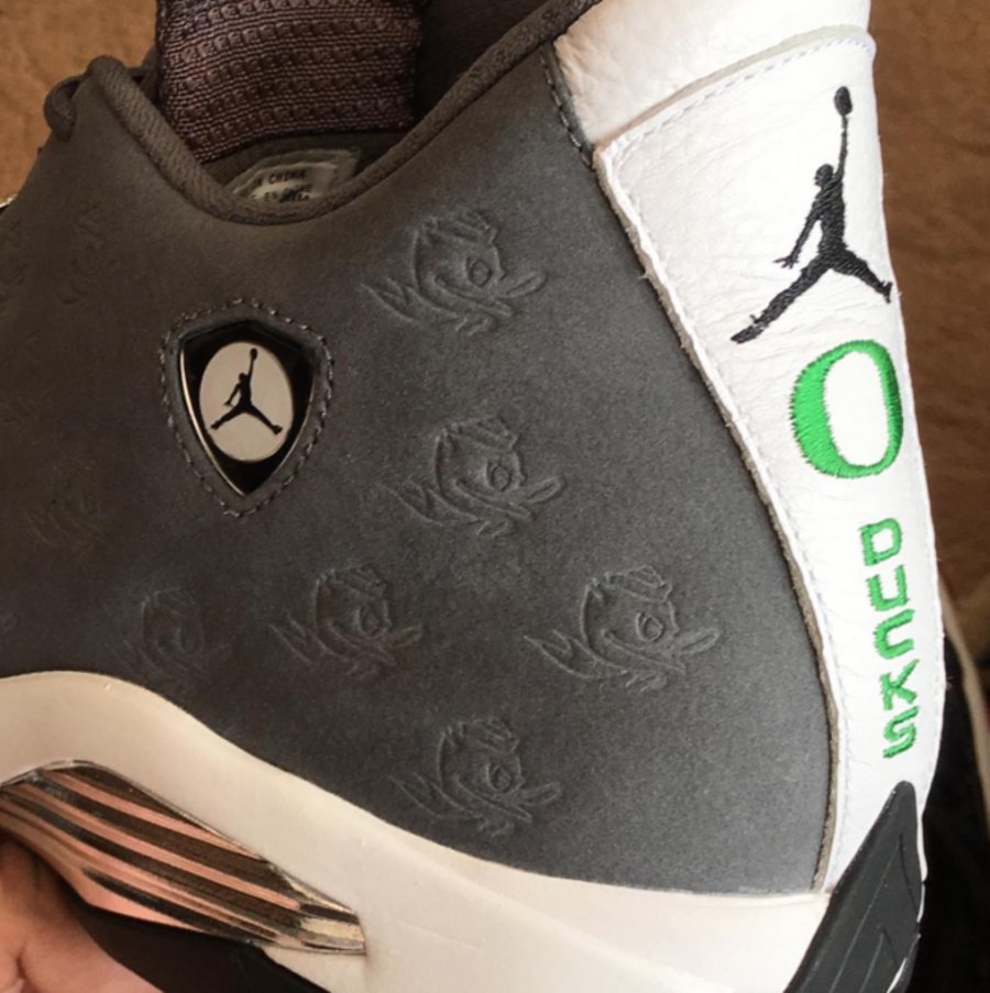 Oregon Ducks 配色亮相 Air Jordan 14 法拉利跑鞋鞋型,这款少见的鸭队专属配色绝无市售的可能,不过在近期亮相 eBay,而售价则高得惊人,为 $5999.95 美元,折合人民币都快 4 万元了,尺码为 US12.5,点击围观。 以简单的灰色鞋面搭配白色中底,凸显了鞋面纹理的独特效果,后跟则以绿色细节展现了 Oregon Ducks 的专属身份。