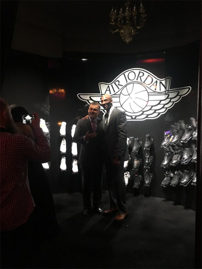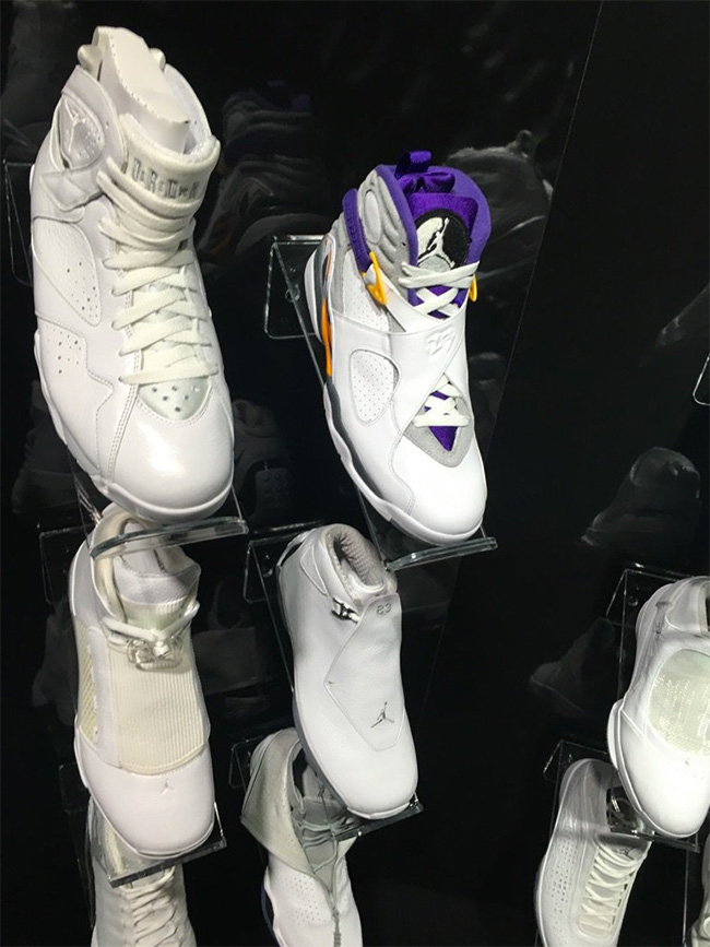之前传言科比曾经穿着过的湖人配色 Air Jordan 3 Lakers PE 和 Air Jordan 8 Lakers PE 有可能回归,在今天出席一个活动的过程中,这两双专属的精美球鞋再度现身。 科比背后的背景墙放满了全白和全黑的 Air Jordan 球鞋,中间插入了湖人配色的 Air Jordan 3 & 8,同时还有一双黑色版本的 Air Jordan 8 “Lakers” PE,湖人队氛围依然十足。 传言将在全明星之际亮相,目前尚无更多的消息。