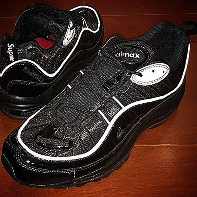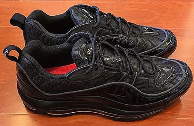 街潮巨头 Supreme 在新的一年继续迎来同 Nike 的合作,此番携手 Nike Sportswear,在 Air Max 98 跑鞋鞋型基础上带来多个联名配色,我们继续为大家带来其中的黑色漆皮款实物图片。