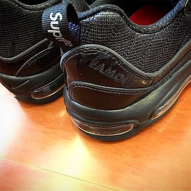 这双 Supreme x Nike Air Max 98 “Black” 以全黑贯穿,但是漆皮材质的光泽效果,以及细节之处的 Supreme 元素,则带来了低调却丝毫不单调的视觉表现力。鞋头和后跟鞋提都带有 Supreme 标志,后跟鞋帮则有 FAMOUS 字样,采用了 3M 反光线条勾勒现身,红色鞋垫上的 Supreme x Nike Air 则直接表明了它的联名身份。