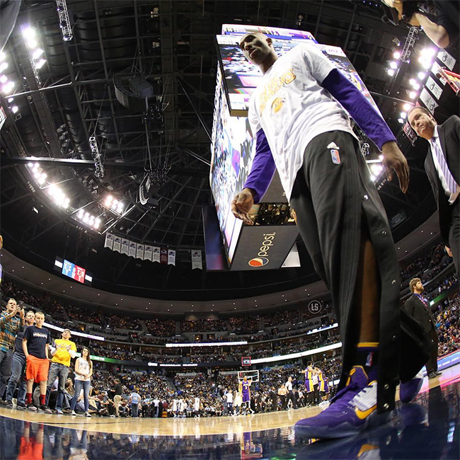 科比在对阵掘金的比赛中穿着了一款让湖人球迷颇为着迷的 Lakers 配色 PE 鞋款。这双 Kobe 11 Elite Low “Lakers” PE 以紫色鞋头拼接白色鞋身,黄色的 Swoosh、Kobe Logo 和内衬装饰在营造湖人队氛围的同时,也带来抢眼的视觉效果。 不仅湖人气息浓厚,白色和黄色在紫色的托衬之下,带来不错的抢眼效果,绝对是湖人配色球鞋中的精品! 科比在下场之后亲签了这双球鞋,然后送给了场边的小球迷,让人羡慕不已!