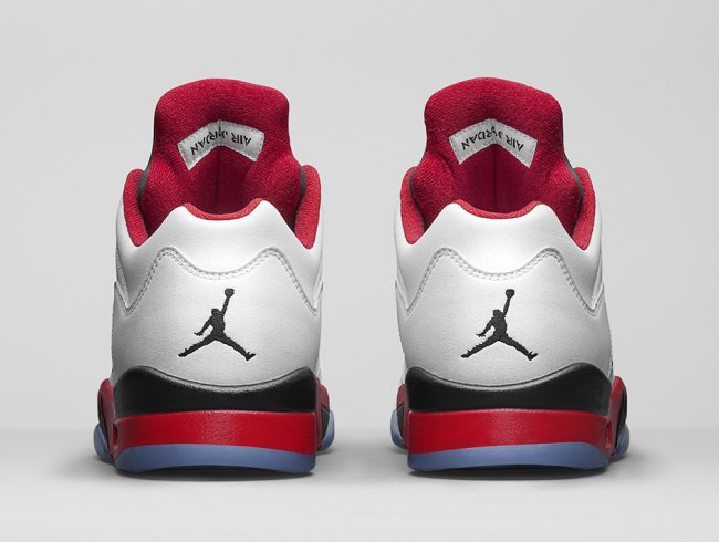这双 Air Jordan 5 Low “Fire Red” 以同样的白红装扮,在白色皮革鞋身上注入黑红细节,黑红鞋舌和红黑中底喷炎依然是经典中的亮点。
