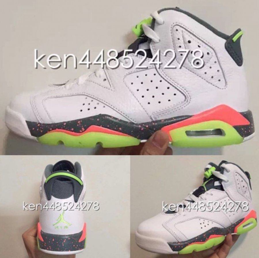 Air Jordan 6 GS 带来两双 2016 新款配色,分别以白色和黑色主体打造,其中的白色款以白色皮革鞋身搭配多彩细节,中底不仅有黑/红外色的泼墨点缀,荧光绿外底也有抢眼表现。货号为 384665-114,预计将在 4 月 30 日发售。 另外一款黑灰配色则以黑灰鞋身搭配蓝水晶外底,货号为 384665-010,预计将在 5 月 21 日发售。