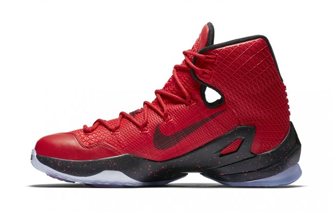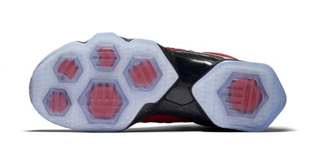 首发的 LeBron 13 Elite “The Hunt” 以红色鞋身搭配黑色细节,外底依然采用了水晶底包裹分离缓震单元。