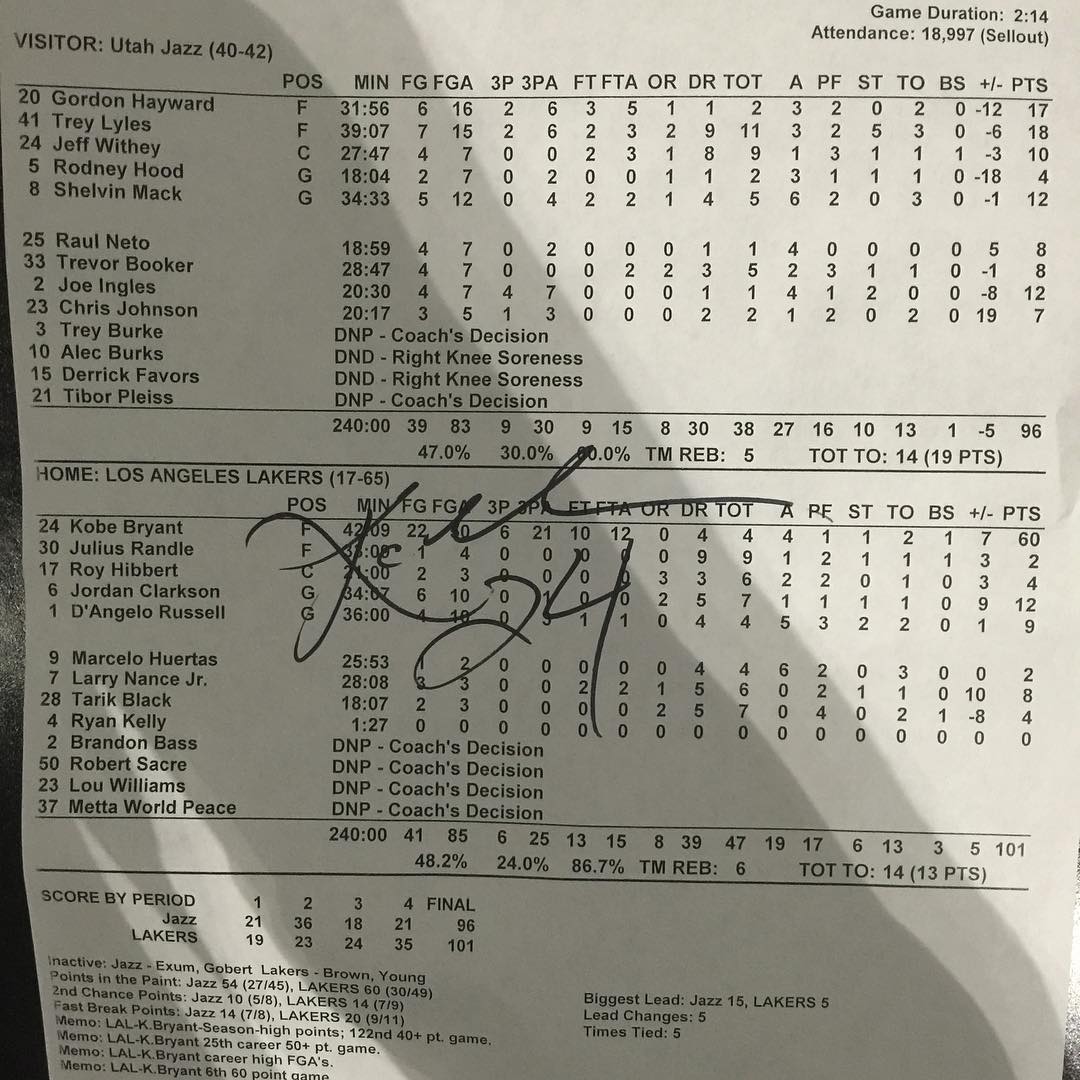 Nick 表示当时自己有些失望,不过这就是科比。随后 Nick Young 还是在自己的社交网络上晒出了科比亲签的当晚比赛统计表,看来科比还是颇为友好对待自己的战友,毕竟是老大哥,毕竟 Young 的名字也在这张单子上,不过是在最下面。。。