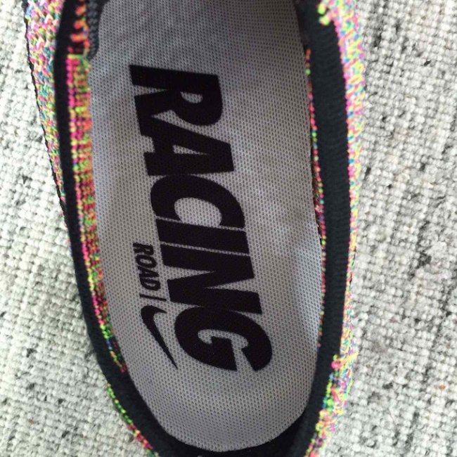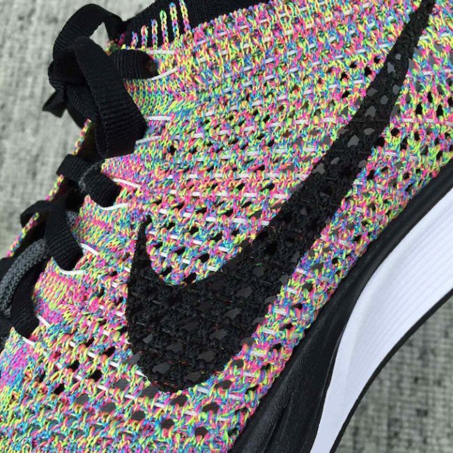 2016 款 Nike Flyknit Racer “Multicolor” 延续了经典的缤纷视觉效果,以编织鞋面呈现了颇有全息光泽的视觉感受。同之前的黑色鞋舌不同,本次采用了灰色鞋舌,而鞋身其他部分则保持了一致。