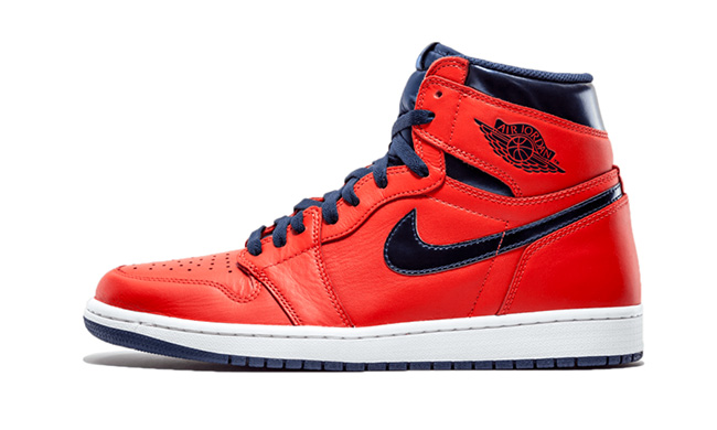 以原汁原味的 Air Jordan 1 OG 鞋型呈现,亮红色皮革鞋身主题辅以海军蓝色的 Swoosh 和鞋舌,细节之处的漆皮光泽凸显,张弛有度的带来亮眼效果。