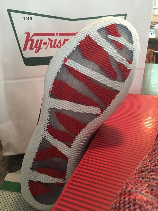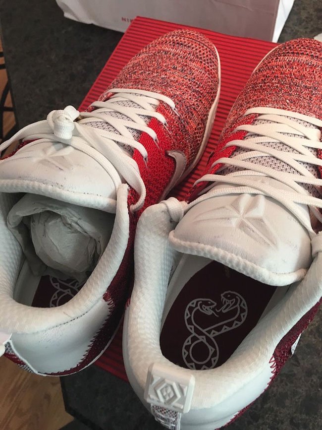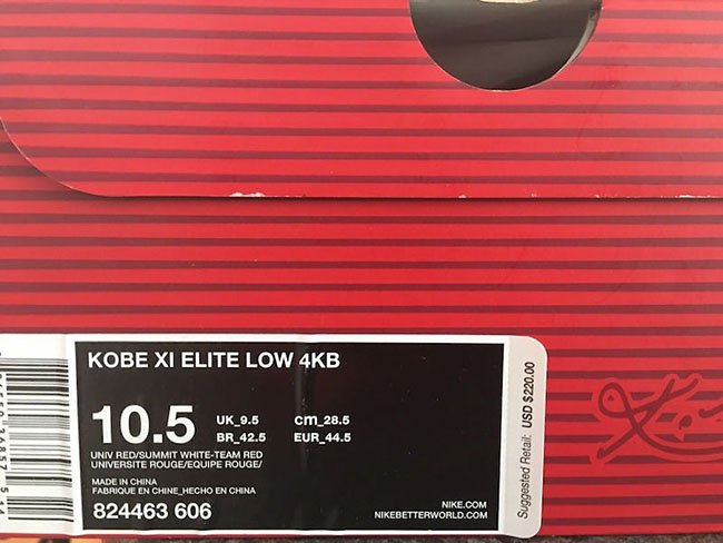 而今天又有更多的实物图片曝光,我们从包装盒上也能看到 4KB 的字样,货号为 824463-606。这款 Kobe 11 Elite Low “Red Horse” 目前在 Nike Ky-Rispy 主题活动中的贩卖车上现身,而这一活动是主推 Kyrie 2 的全新甜甜圈配色。