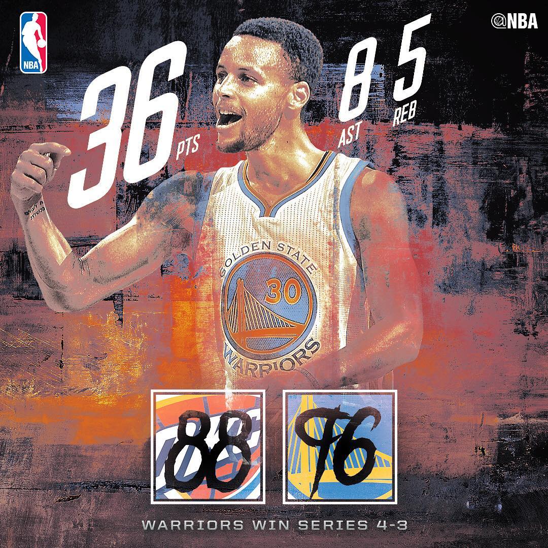 今天的甲骨文球场迎来万众瞩目的抢七大战,勇士凭借在第 3 节的一波流反超比分,并且在气势上压倒对手,通过强硬的防守和进攻的多点开花,将优势保持到了终场! 以 96-88 的最终比分成功夺得西部冠军,得以晋级 2016 NBA 总决赛!也成为了第 10 只在季后赛 1-3 落后又成功翻盘的球队! 无论是两连冠的荣耀,还是为 73-9 的逆天记录完美收尾,勇士队对于本届总冠军奖杯的渴望已然爆棚,同骑士队的巅峰对决值得一百分的期待! 双方的第一场比赛将在北京时间本周五上午 9:00 进行。