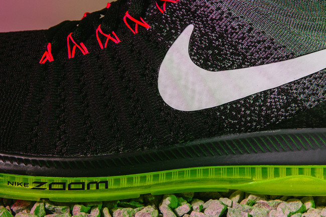 完美的融合了 Nike 最新和最顶尖的运动科技,采用了类似 LunarEpic 的 Flyknit 编织鞋身,同样是袜套的高帮呈现,而缓震方面带来了全掌的 Zoom Air 可视化鞋底,也是鞋型名称 Air Zoom All Out 的完美体现!