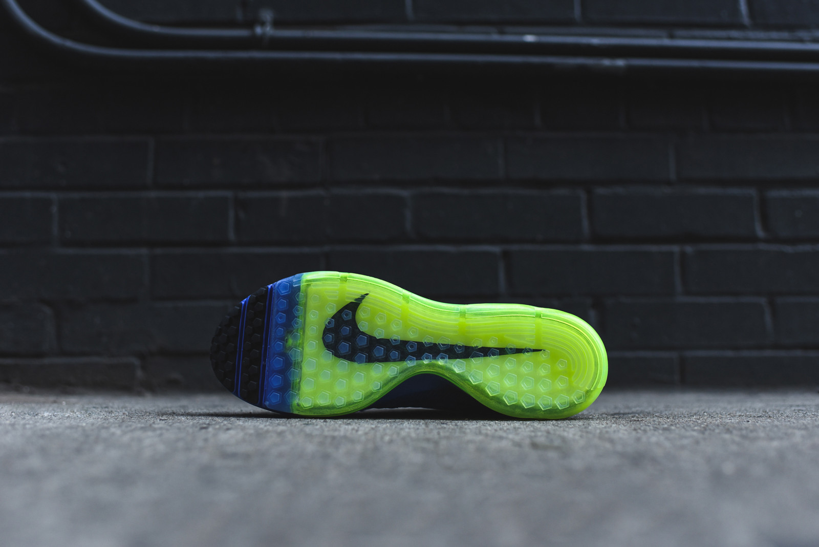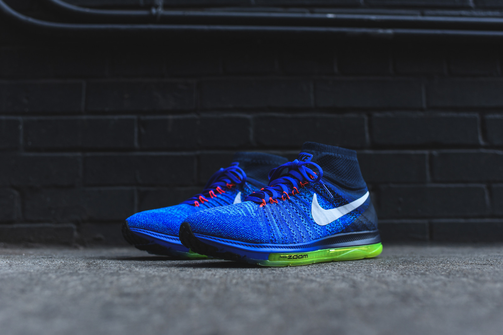 除了黑灰广告配色,Nike Air Zoom All Out Flyknit 还将带来一款雪碧配色的抢眼亮相。 这双 Nike Air Zoom All Out Flyknit 以蓝色的 Flyknit 编织鞋身搭配荧光色的 Zoom Air 全掌鞋底,渐变的鞋身效果则更添精致风范,而多个亮色系的交织搭配,在原本就颜值极高的基础上又带来不断的亮点闪现,相比黑灰配色,更为活力四射! 货号:844134-401 发售价:$200/¥1599