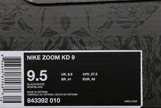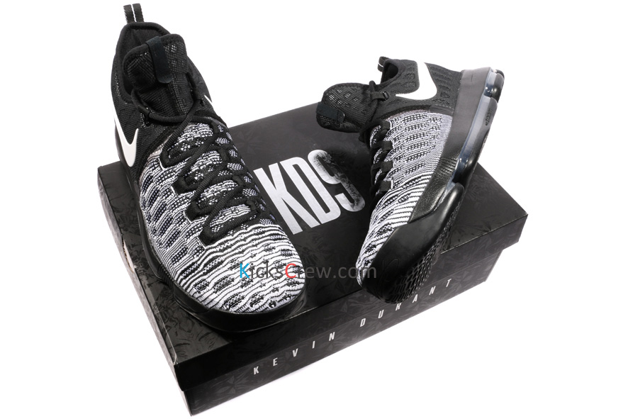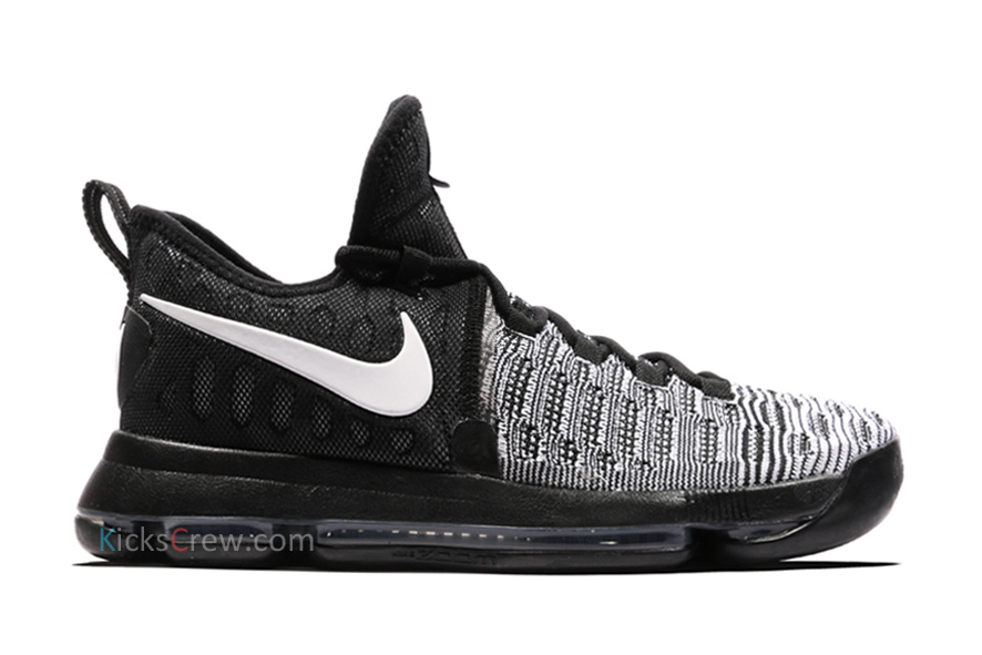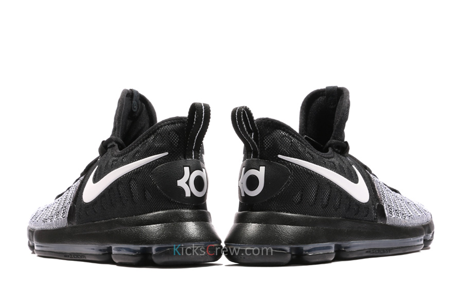采用了 Flyknit 编织鞋身搭载全掌开窗的 Zoom Air 中底,黑色主线之上又以白色呈现了 Swoosh 和 KD Logo 等元素,明快大方的呈现了一款实战篮球鞋的新貌。