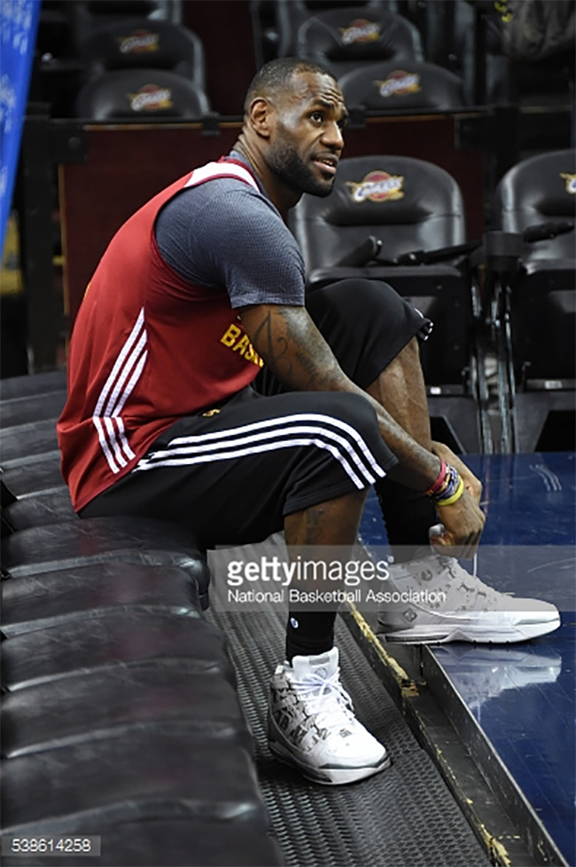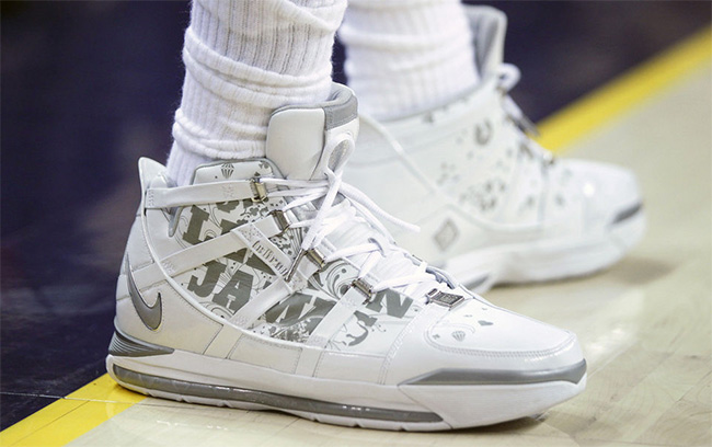 詹姆斯再次在训练中上脚了自己的经典老款战靴,今天带来的是一双 Nike Zoom LeBron 3 PE。 白色的鞋身上带有 LEBRON JAMES 的镭射字样,浓浓的 LBJ 气质彰显无遗。 在去年 4 月份的比赛中,詹姆斯也曾近以这双配色亮相赛场,不过很快就换上了 LeBron 12。