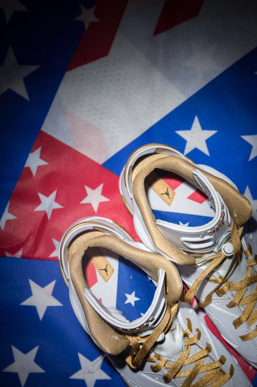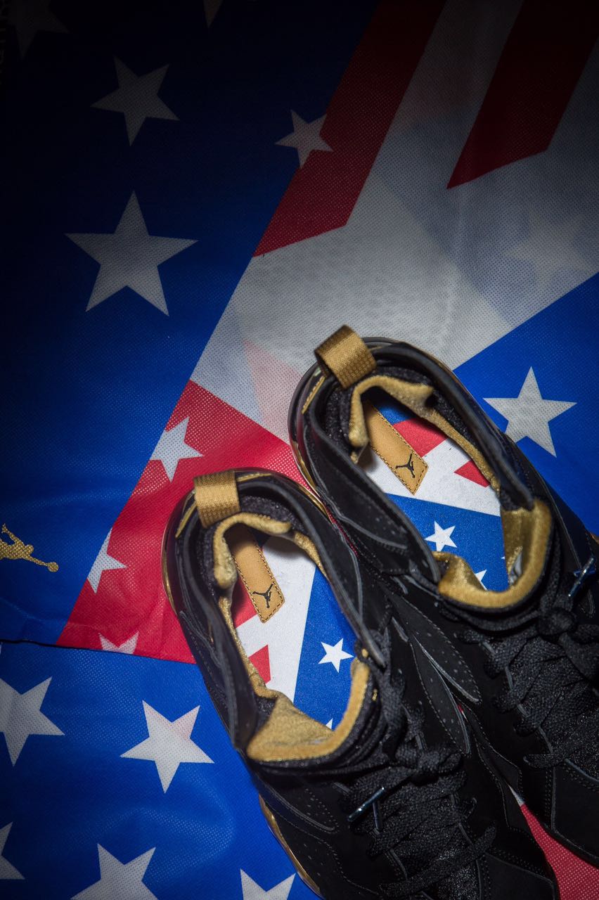 除了球鞋本身极其诱惑的黑金、白金配色之外,两双鞋还各附一个带有星条旗图案的防尘袋,将美国梦之队的设计主题表现的淋漓尽致,此外还套上特别设计的抽屉式鞋盒,鞋盒上附有6+7的金色特别logo。