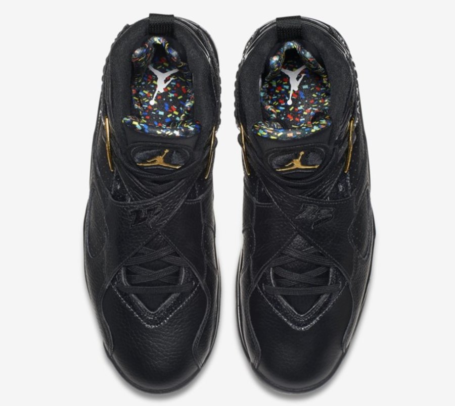 Air Jordan 8 “Confetti” 五彩纸屑配色则以全黑鞋身装饰同样的金色细节,特别之处在于鞋帮的多彩斑点,不仅完美契合多彩纸屑主题,营造出的精细抢眼效果也让人难忘!