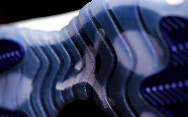 除了后跟以刺绣方式呈现了数字 45,蓝色的水晶外底托衬效果以异常抢眼。同时黑色漆皮部分看起来比 OG 款要占据更大面积,漆皮的光泽效果在整体视觉中的占比也随之扩大。