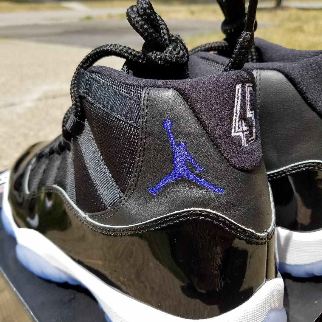 相比于经典的 OG 配色,这双 2016 款的 Air Jordan 11 “Space Jam” 并没有采用抽屉鞋盒,后跟以刺绣的方式呈现了 MJ 首次复出时身披的背号 45。