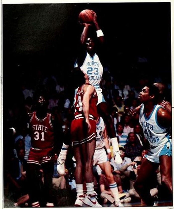乔丹起初并不喜欢 Air Jordan 1 的设计,并称之拥有 “魔鬼” 的配色。乔丹口中的 “魔鬼” 实际上是指当时北卡罗莱纳大学的死敌北卡州立大学。北卡州立大学的球衣颜色同样是黑红及白红搭配。▽乔丹身穿北卡罗来纳大学队服对阵北卡州立大学