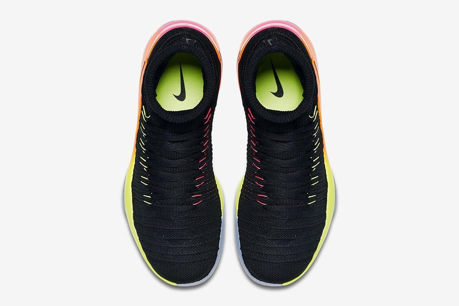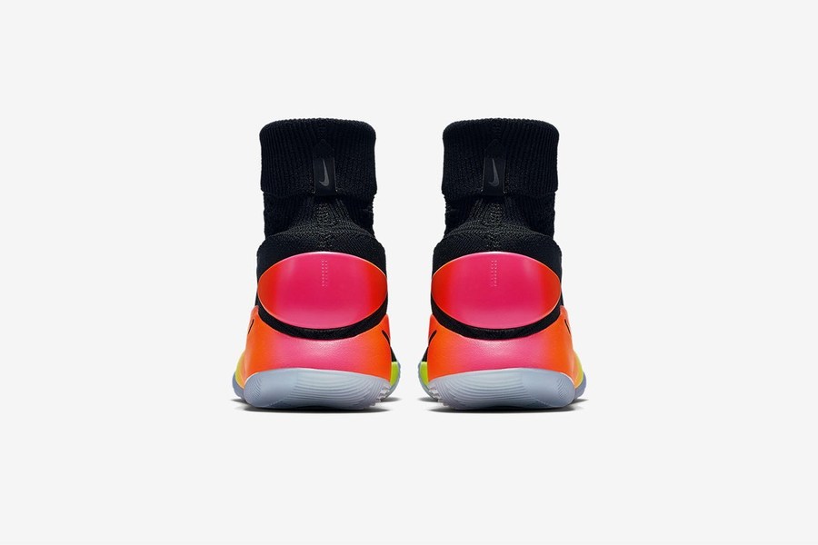 这双 Nike Hyperdunk 2016 Flyknit “Unlimited” 黑色的编织鞋身装饰荧光黄和粉色的 Flywire 动态飞线,而多彩的中底渐变在深色鞋身的托衬之下更显夺目效果!