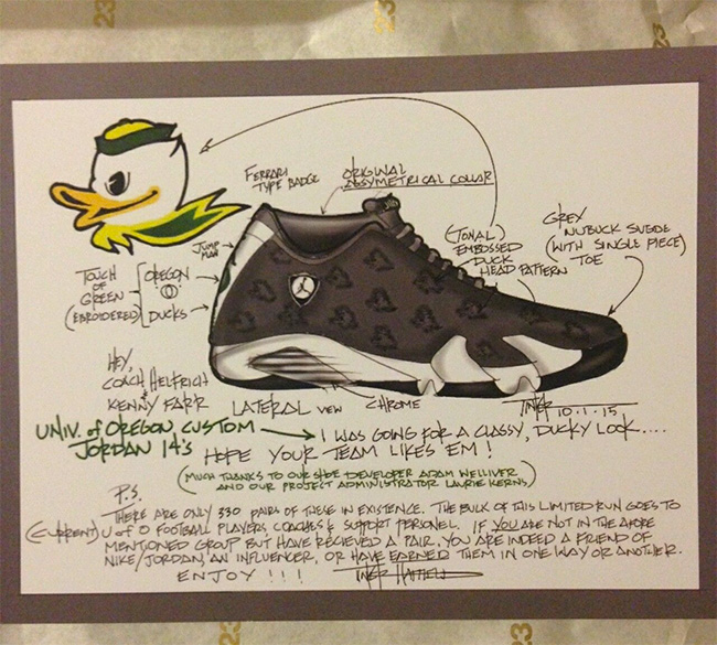 不光在鞋面上呈现了 Oregon Ducks Logo,附带的 Tinker Hatfield 设计手稿,还表明了它的灵感实现过程。