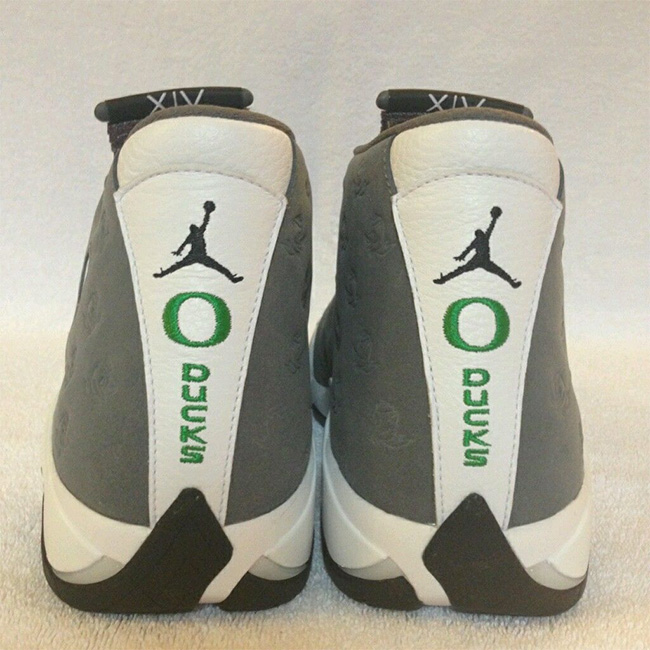 这双 Air Jordan 14 “Oregon Ducks” PE 已经多次曝光了,目前在 eBay 上的售价在 $7500 美元(折合 ¥49912 RMB)左右,并且货量只有唯一的一双 US11 尺码。