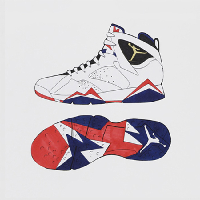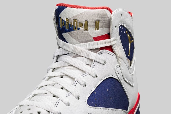 汀克的 1992 年草图赋予 Air Jordan 7 美国国家队配色。此次推出的设计在 Jumpman 标志和鞋带头处加入金色元素,向球队当年的凯旋大战致敬。鞋跟美国旗帜中巧妙融入数字 9,这正是 MJ 在奥运战役中的球衣编号。