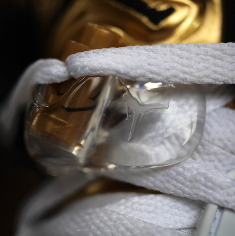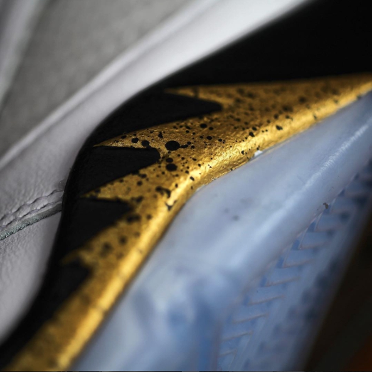这双基于 AJ5 为基础,注入全新奥运金牌元素的球鞋,以白色鞋身搭配鎏金鞋舌及中底火焰,再配以淡蓝色水晶外底,造就了极为耀眼的视觉体验。