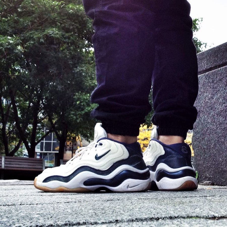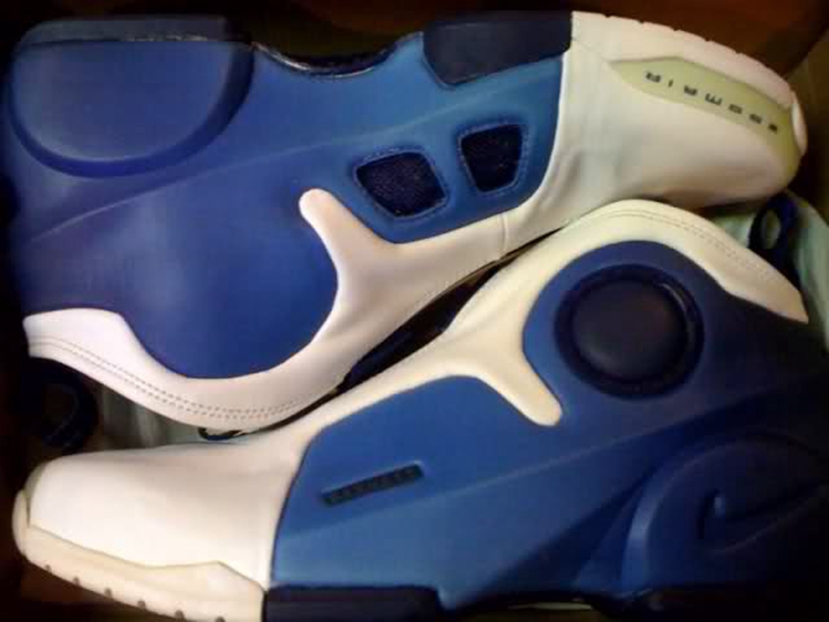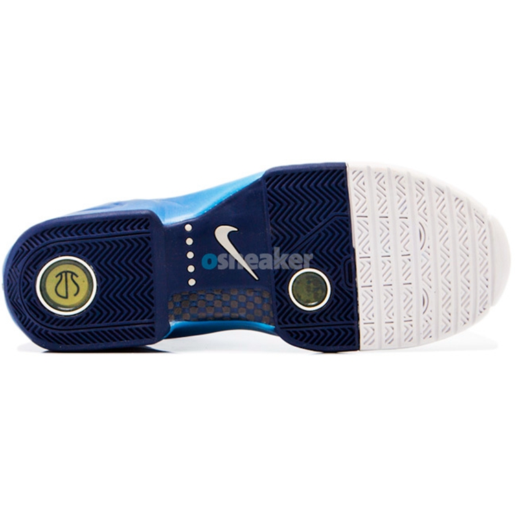 该鞋继承了九十年代 Nike 一贯的前卫设计,鞋身采用白色皮革衔接蓝色编制材料类似 Air Max 95 的分层设计,镶有环抱后跟 TPU 稳定片的上翻中底内,隐藏着一片羡煞旁人的全掌 Zoom Air 气垫。年轮状的个性外底包裹着足弓大面积碳纤维承托盘,如此强悍的性能堆积,可谓当时的业界良心。