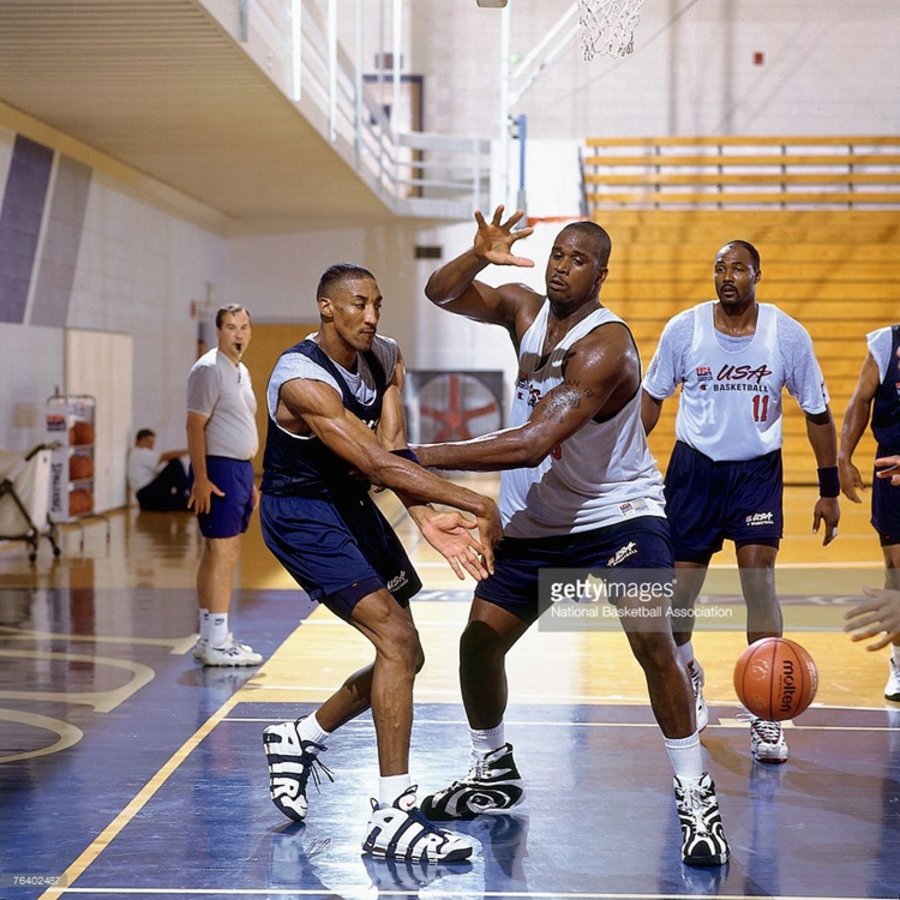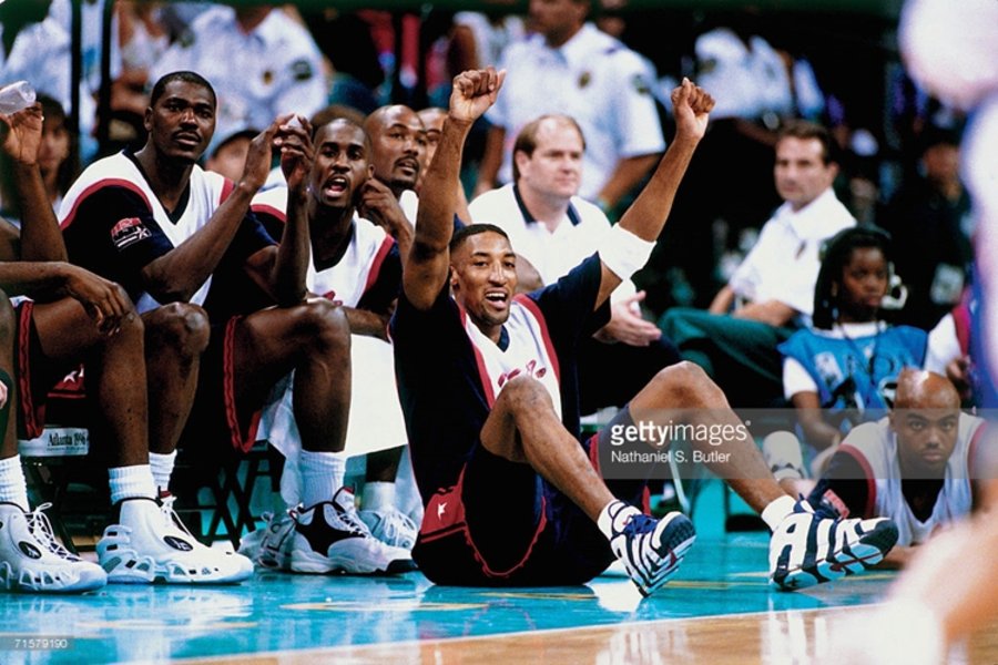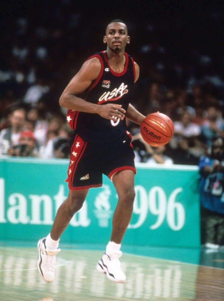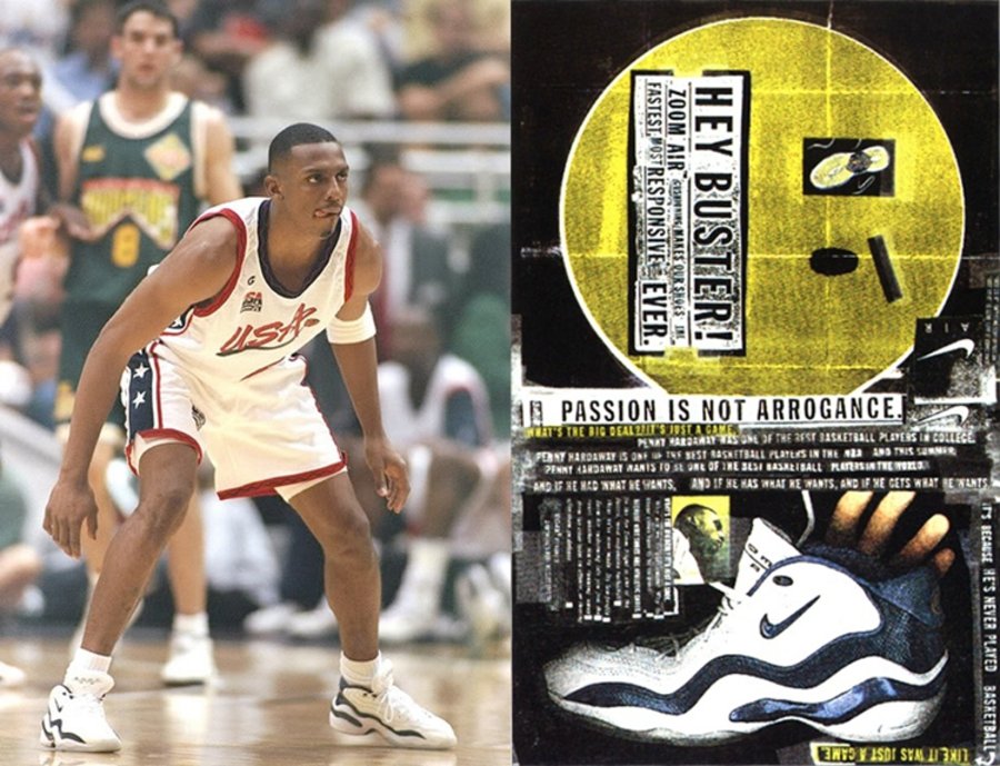 Zoom Flight 作为 Nike 篮球鞋一个重要派别,每一代都有顶级后卫的光环加持,例如 Zoom Flight 95 的基德,Zoom Flight 98 的佩顿,本次位列第八名的 Zoom Flight 96,所被人熟知的代言人就是亚特兰大奥运会上身披“梦三队” 6 号的安芬尼·哈达威。▽ 安芬尼·哈达威与 Zoom Flight 96