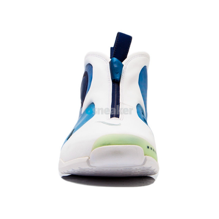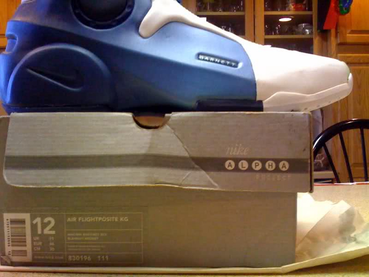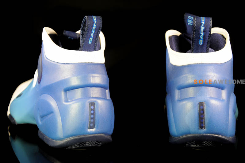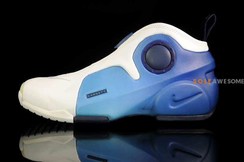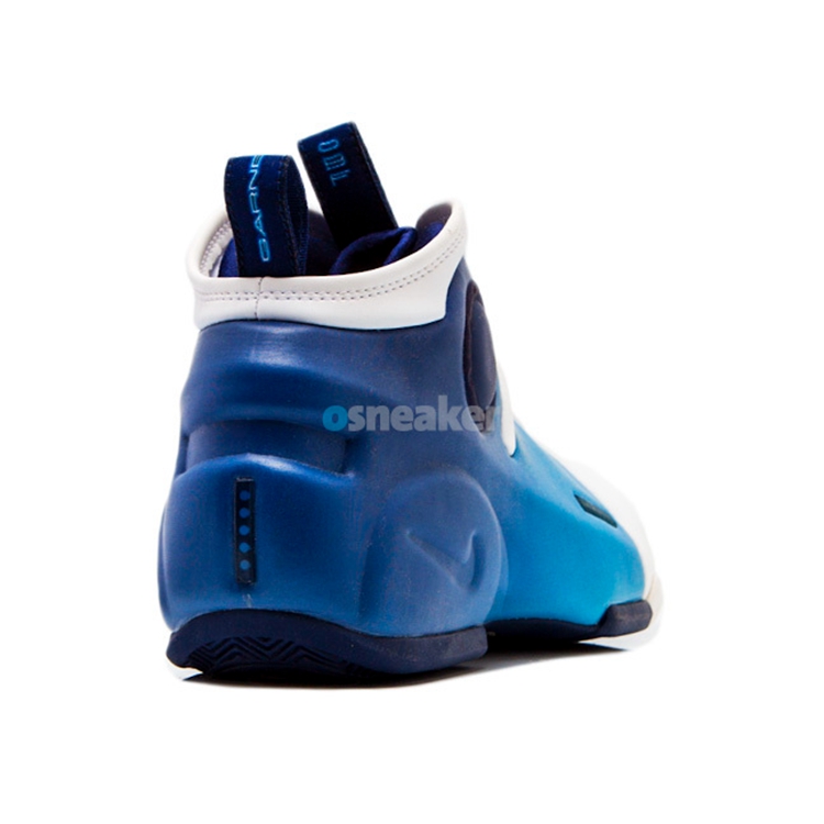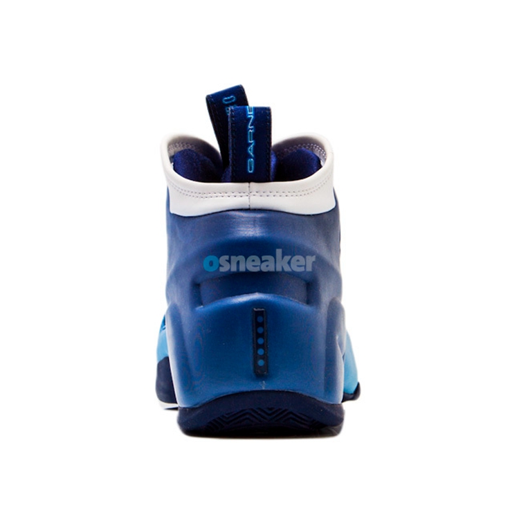 该鞋作为风派旗舰 Air Flightposite I 的第二代产品,延续了一体成型的蓝色发泡材料与白色类似麂皮相结合的无中底设计思路。鞋身内侧同样继承了小开窗设计,造型上更加充满纤细的肌肉感。在侧面及鞋提的 Garnett 文字标识,急切的向我们宣告着它的主人是谁,大面积碳板的加持及后跟的 Alpha 五点标志被众多鞋迷视为顶级球鞋的象征。镶于鞋垫内部的前后分掌 Zoom Air 在当年可谓是逆天的穿着体验。