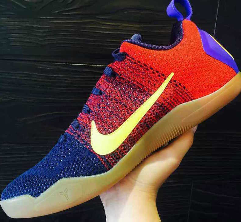 这双 Kobe 11 Elite Low 采用了黑蓝和黑红渐变编织鞋面点缀黄色的 Swoosh,外底则以生胶色托衬,重点在于鞋盒上的货品名称写明了 Mambacurial 字样!