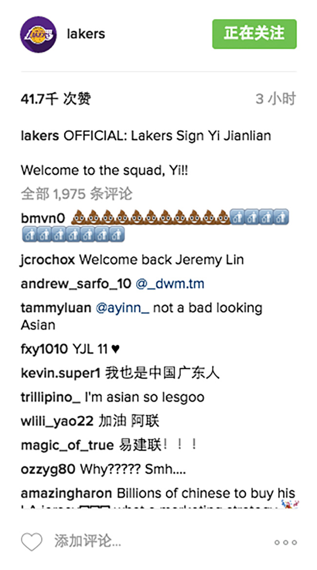 洛杉矶湖人队官方 Instagram 账号正式宣告了中国球员易建联的加盟! 易建联将于下赛季身披 11 号湖人球衣,重返 NBA 赛场! 易帝在自己的微博上也更新了来到湖人训练场馆的图片,下赛季的 NBA 期待多多! 评论里居然有个哥们说“欢迎回来林书豪”...Welcome back Jeremy Lin... 看在你亚洲人脸盲症的份上就饶了你...