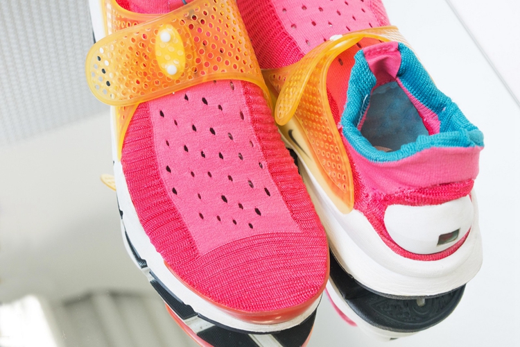 时值 2004 年,Nike Sock Dart 经由恐怖三人组 HTM 参与设计与研发。作为首款使用电脑编织技术打造的鞋款,平纹织物鞋面由于当时科技的限制,还需在已经织好的鞋面上利用激光打孔技术以保证足够的透气性。在羽量级的鞋身上,Nike 开发团队尝试在不同位置探寻简洁而有效的支撑包裹方案,最后确定采用矽胶搭带来代替传统鞋带(懒癌患者的福音啊),不仅带来舒适服帖的穿着体验,更为这款本就造型不羁的前卫鞋款注入了简约实用的创新设计。不过令人遗憾的是,由于当时电脑织物鞋面技术并不成熟,所以该鞋仅在日本地区少量发售便销声匿迹。