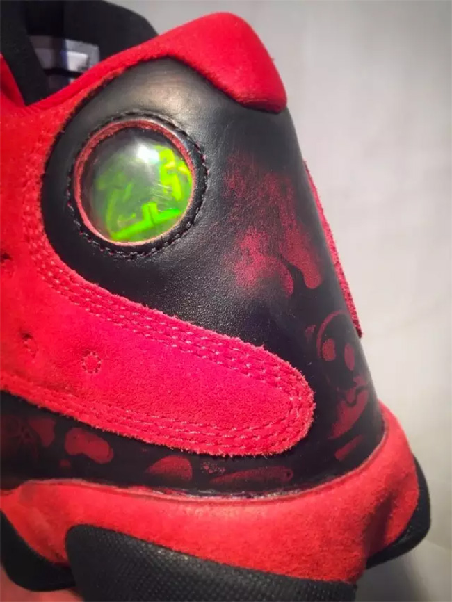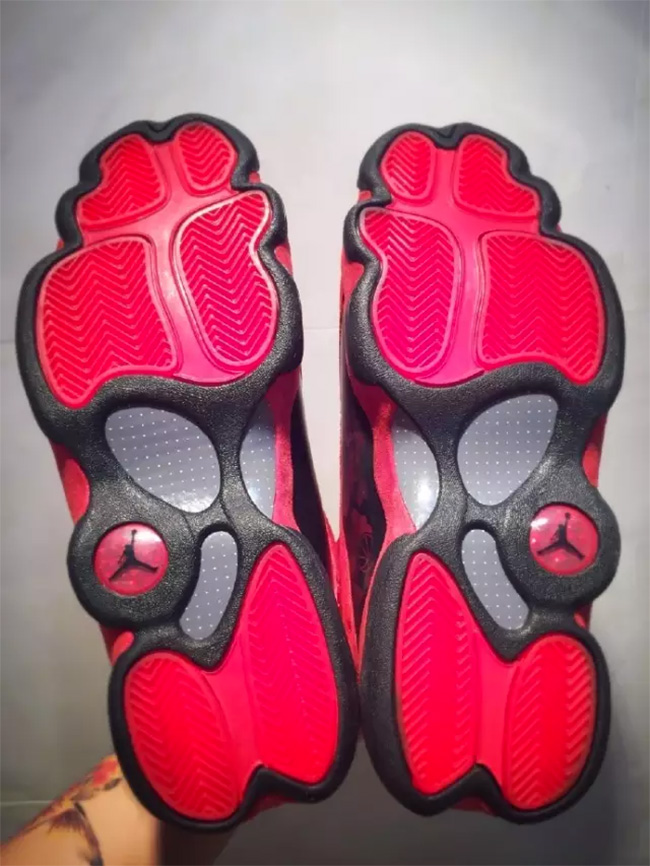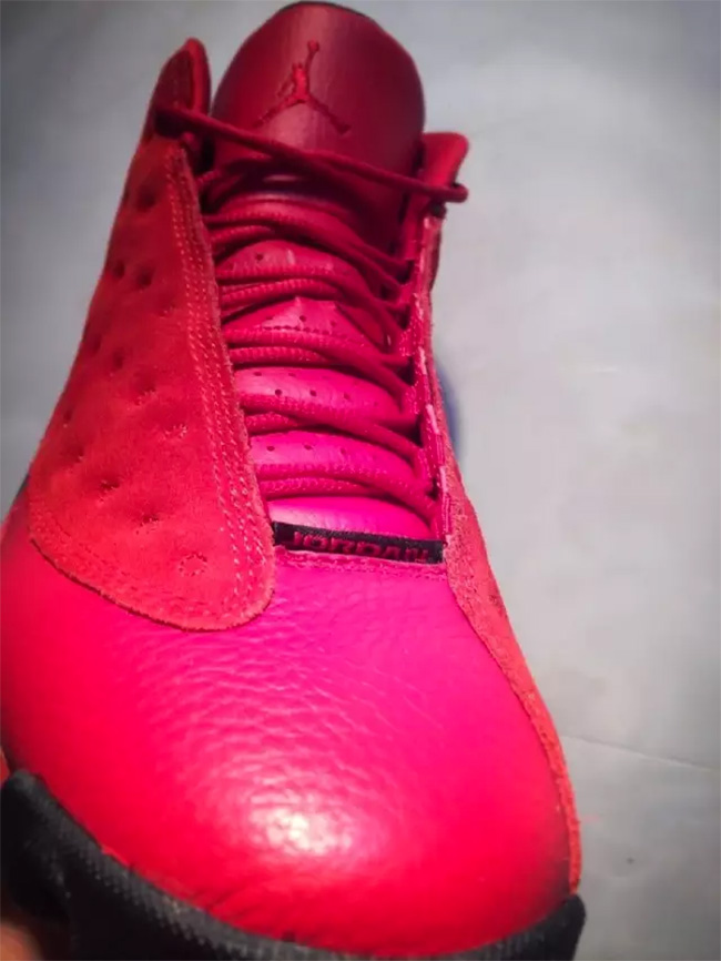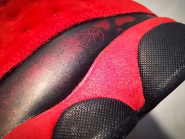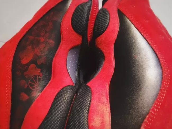 昨天我们曝光的中国光棍节配色 Air Jordan 13 “Chinese Singles Day” 不仅以大红的麂皮鞋身带来抢眼的视觉冲击,其隐藏的刮刮乐效果更是让人难以抗拒的重要元素! 今天曝光的实物新图,除了一览其红妆黑饰的惊艳外观,黑色皮革部分还带有同 Air Jordan 12 “Wings” 一样的隐藏属性! 以 11 月 11 日双十一为主题打造,不知会不会也在那一天发售呢?