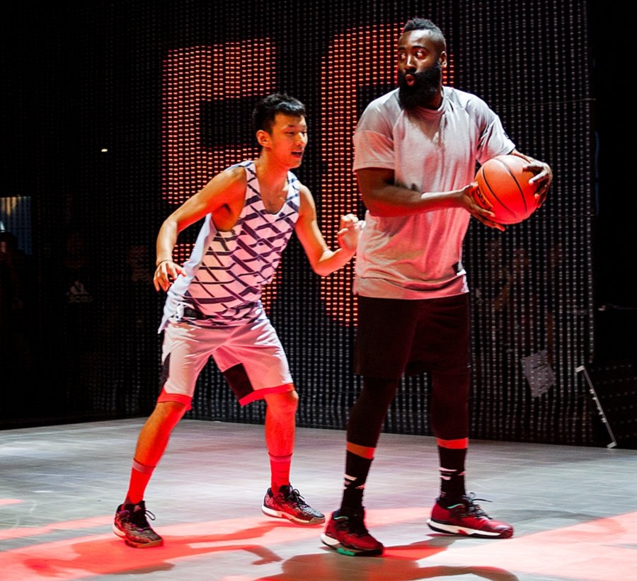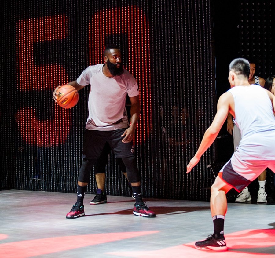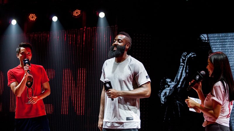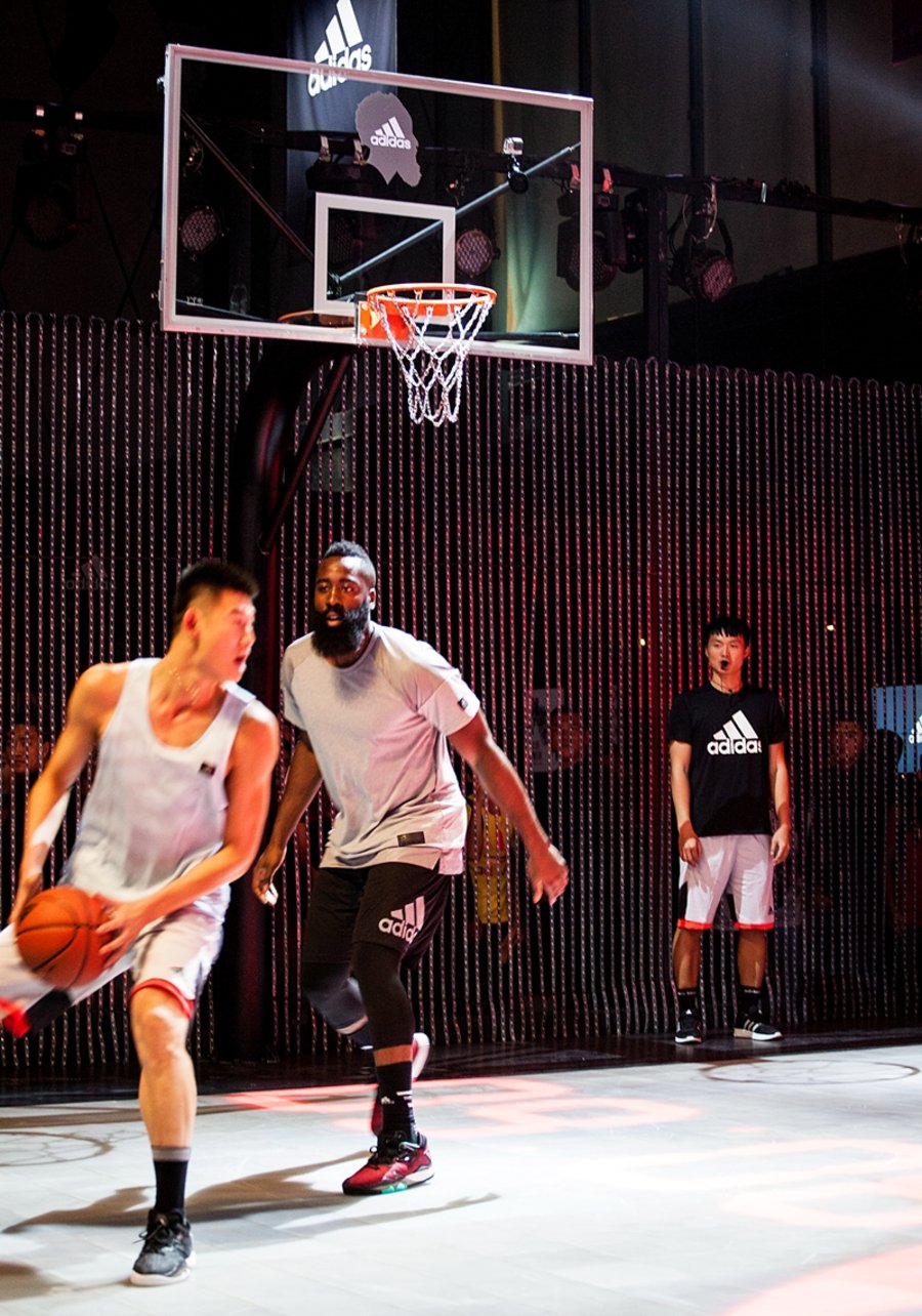 在结束了媒体和球迷的见面会后,哈登来到位于一楼全新打造的灯光球场。在此前“火拼2016,魔练征途”中担任现场 MC 的刘芳宇和美女周玲安隆重介绍下,詹姆斯·哈登热力登场。