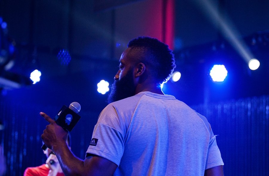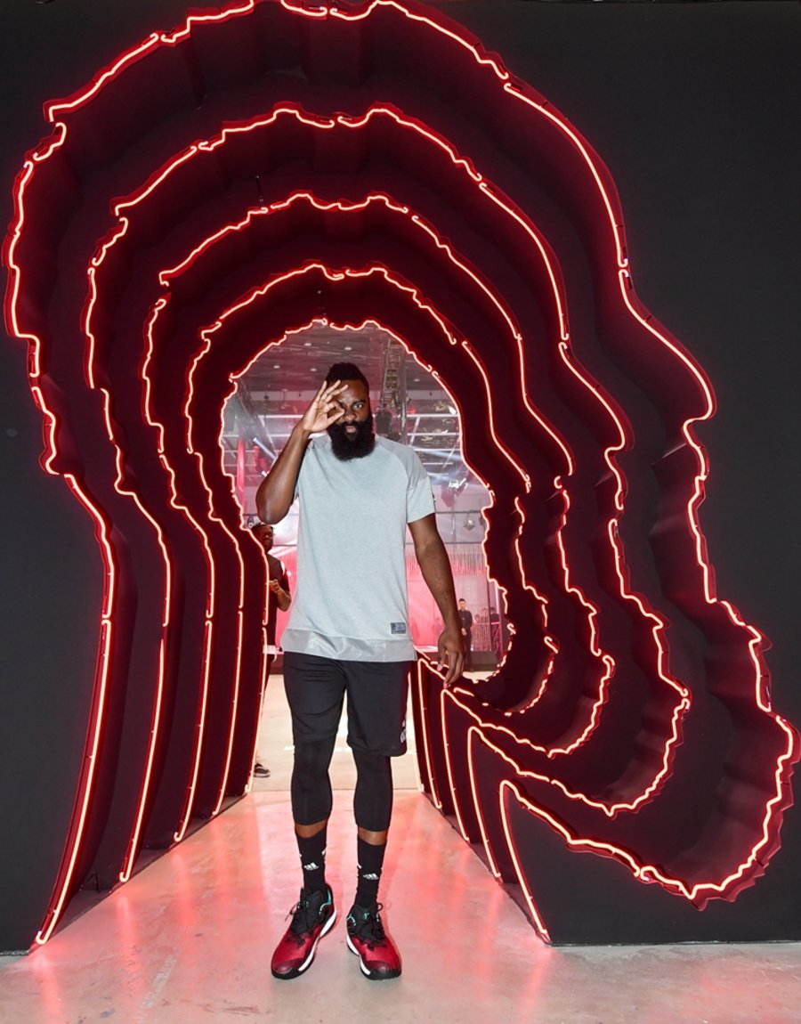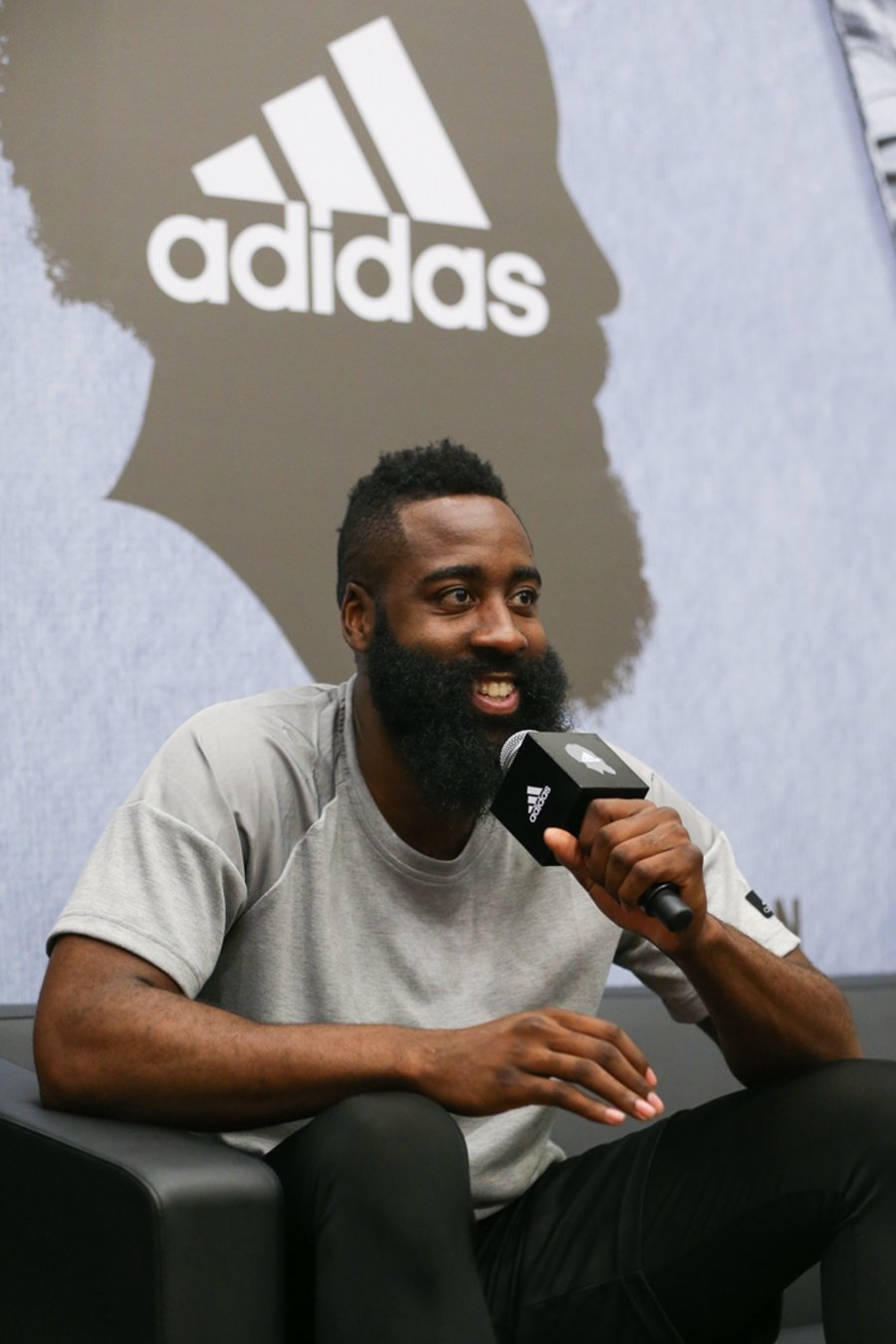 经历了长途飞行及傍晚突如其来的暴雨,哈登以一身休闲装扮出现在三里屯 adidas 特别打造的哈登中心。见到冒雨等候的登迷,旅途的劳累一扫而光,很快落座与在场媒体畅谈新赛季的展望和自己参与设计的 Project Harden 企划进展。
