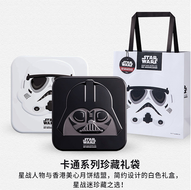 第一次看到这个星战主题的月饼,小编就有冲动马上收上 10 套!不仅有 Lucasfilm 的官方授权,一黑一白两个主题组成套装,绝对是星战迷、科幻迷、动漫迷的必入款!
