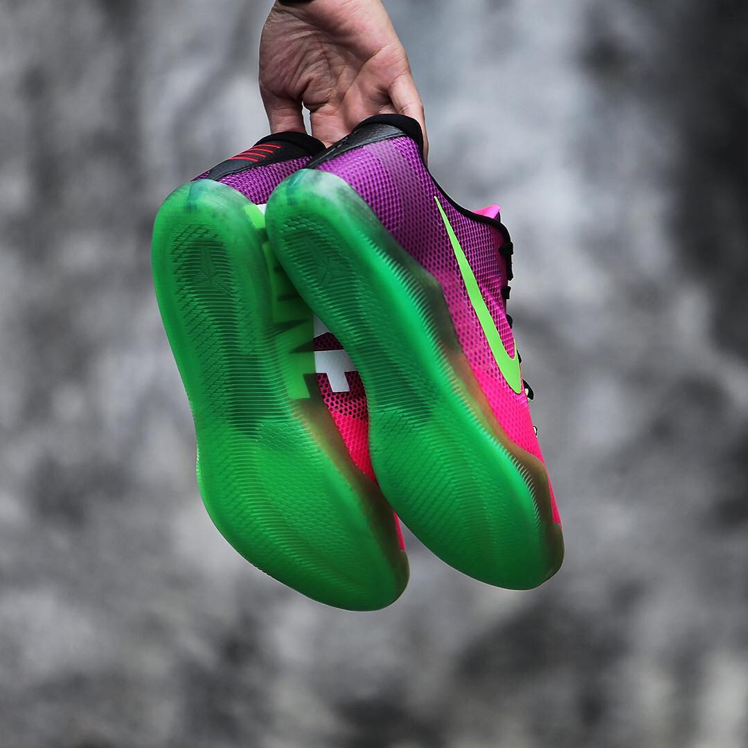 这双 Kobe 11 EM “Mambacurial” 以熟悉的粉紫鞋身搭配亮绿色的 Swoosh 和外底,多个亮眼色系的完美结合,在营造刺客经典装扮的同时,视觉冲击力自然是让人无法回避!