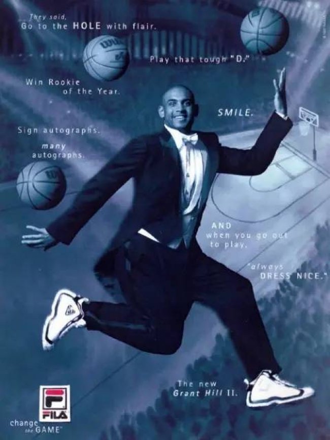 同年为FILA Grant Hill II打造的广告也趣味十足。穿着燕尾服的希尔以颇为滑稽的造型穿着FILA Grant Hill II,玩弄3个篮球的造型也让人们记忆深刻。在海报上写出了人们对希尔的肯定与对希尔的质疑,但是这些都不重要,在广告右侧写出的两句话才是这双鞋款的以及这个海报的根本定义。
