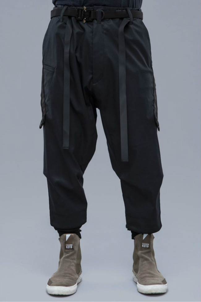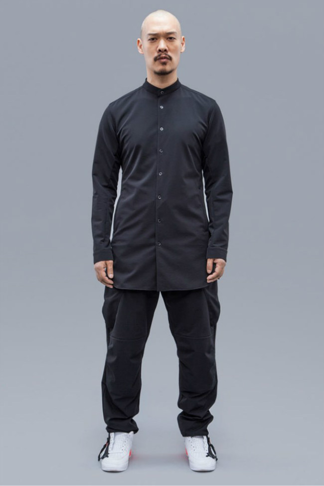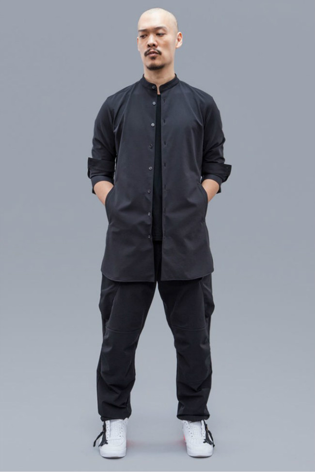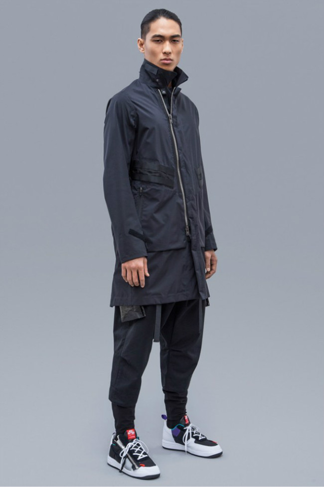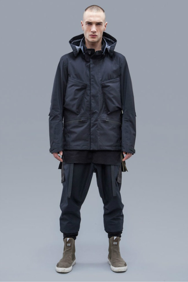 在 ACRONYM 2016 秋冬系列中,机能与外观被无缝结合到一起。在黑色与橄榄绿两个百搭色调的贯穿下,多款 GORE-TEX® 外套加入了可拆卸连帽、隐藏式口袋、独立开合以及独特的索带系统,大大地增加了外套的便携性。在裤装设计上,两侧双拉链大口袋带来了硬朗的军装气息,Errolson 还加入反向圈线拉链裤口与收纳不同配件的小口袋,并对膝部和后部进行加强。