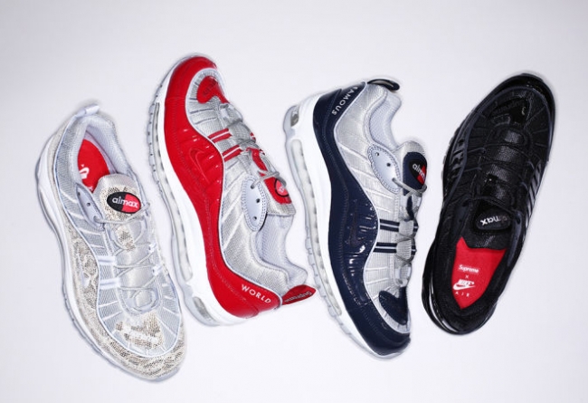 街头潮流的领军品牌 Supreme 继续着同 Nike 的联名合作,此番选用 Nike Air Max 98 作为蓝本,不仅带来 4 款配色,细节依然是 Supreme 经典元素的抢眼展现,以精致的细节展现了 Supreme 的名牌身份,鞋头、鞋垫和后跟鞋提都带有 Supreme 字样,而蛇皮纹饰和深色款的多彩漆皮光泽,都凸显了它的不凡气质。