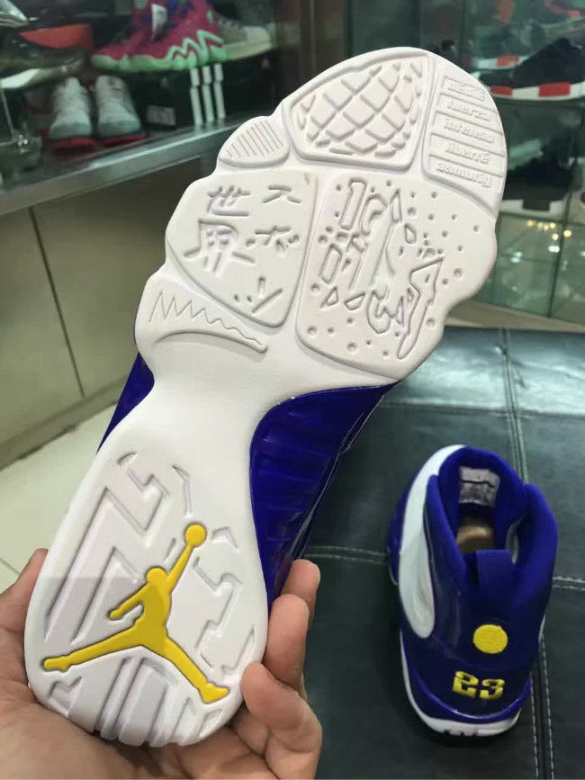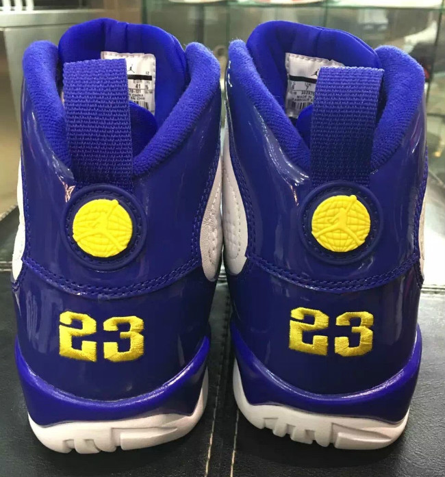 此番 Air Jordan 9 由紫色漆皮包裹着白色皮质鞋面,银色鞋扣搭配亮黄色 Jumpman 标志。值得注意的是,这双市售版本后跟并未使用原始样品的数字 8,而是以传统的黄色数字 23 呈现。
