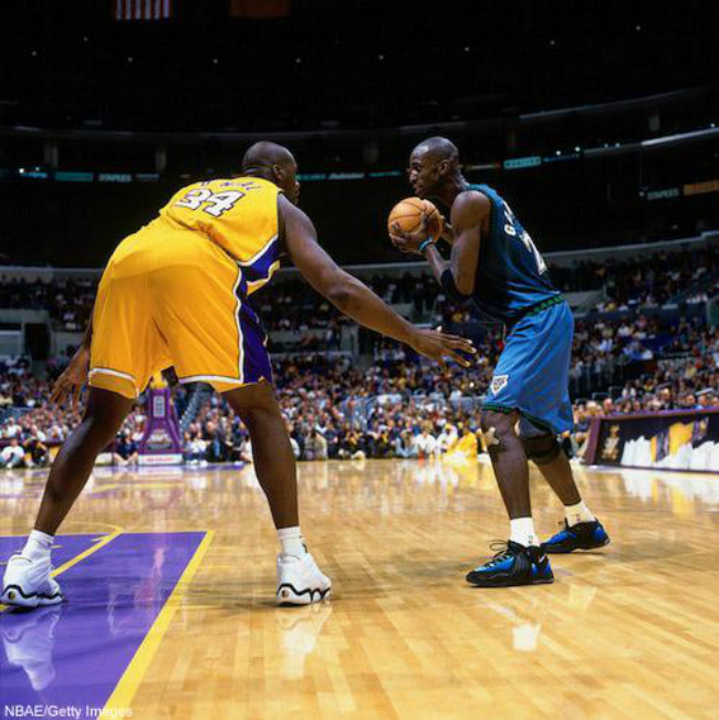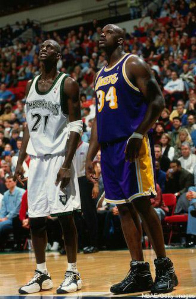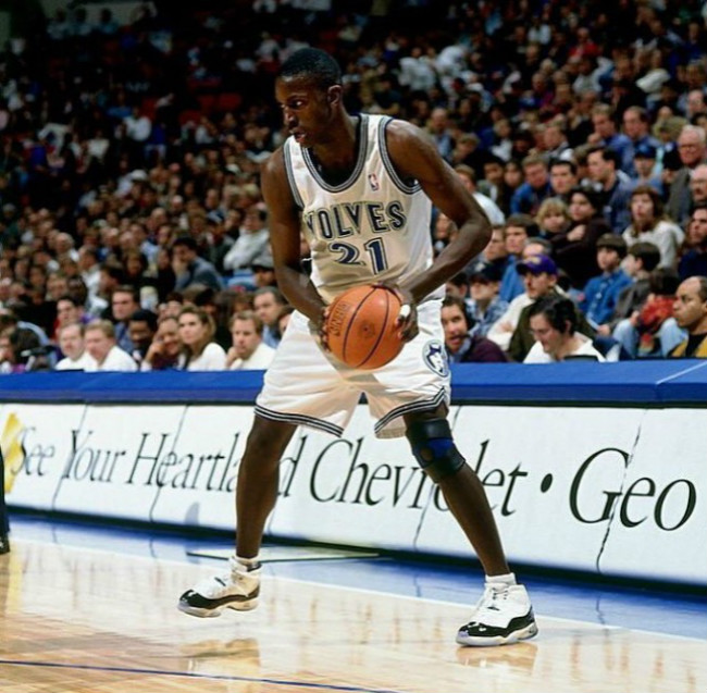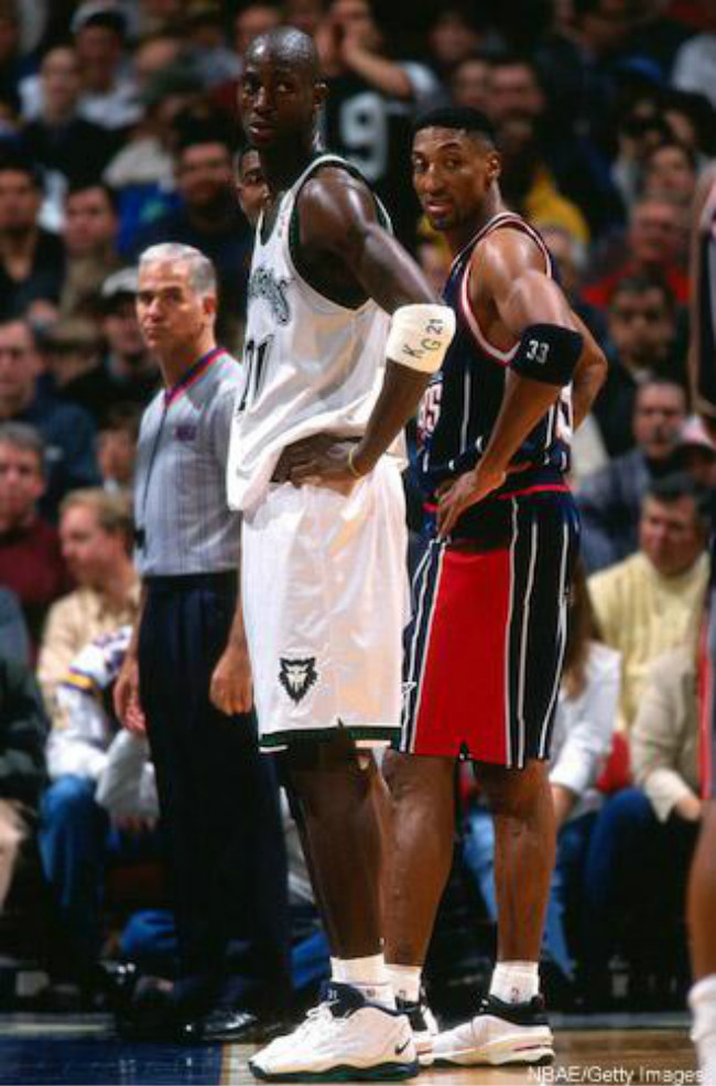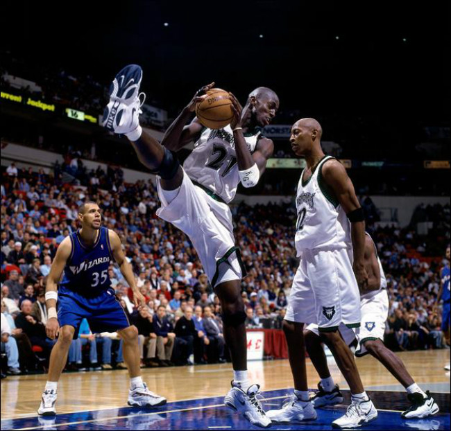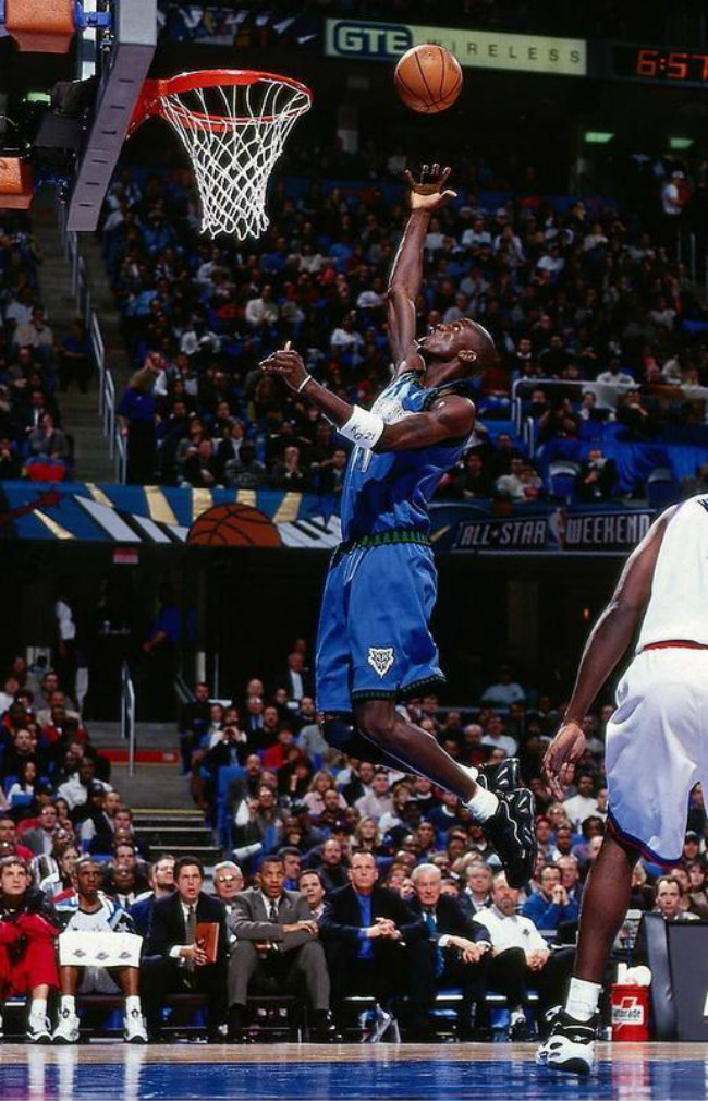 早期加内特并未与品牌签约,所以上脚乔老爷子的球鞋。