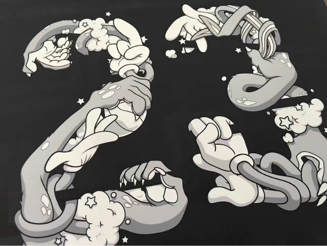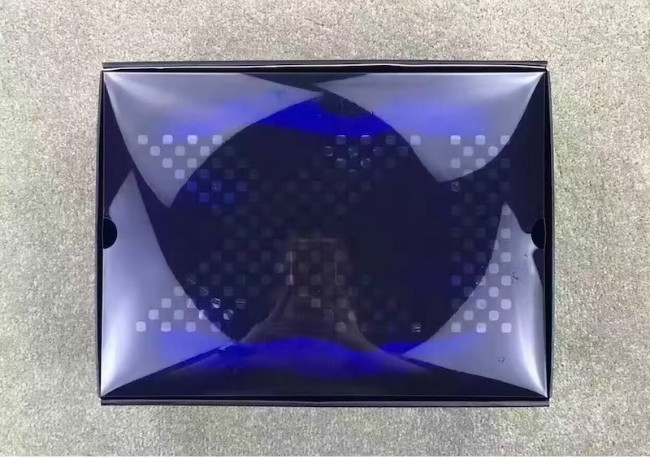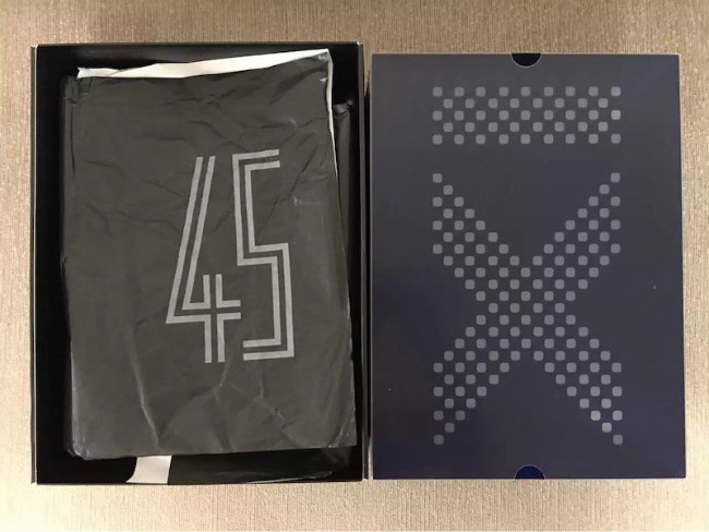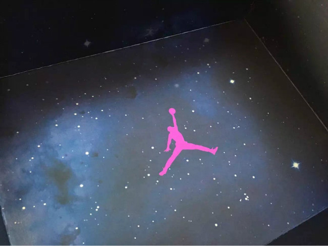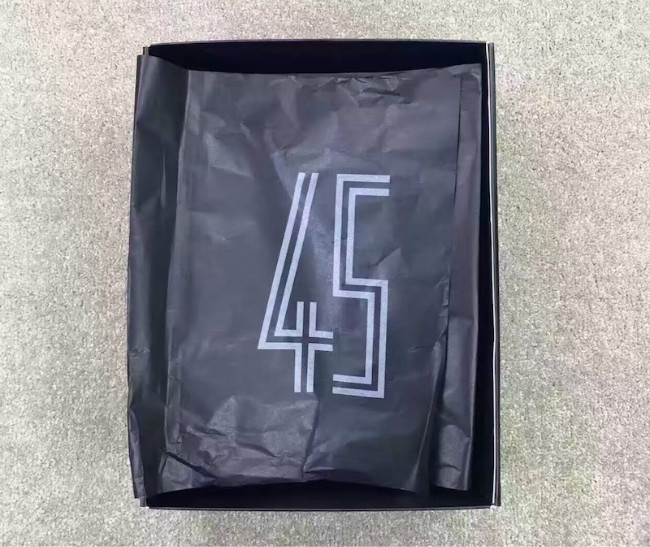从图中可看出,空中大灌篮的主题贯穿整个鞋盒。包装纸与鞋盒上清晰印着数字 45,鞋盒内红色的 Jumpman 标志显现在星空之中,还有兔八哥与怪兽的手臂组合在一起的数字 23,数字 11 是由点阵图形印在塑料盖上。该鞋盒可以称得上是精品之作,细节完美。