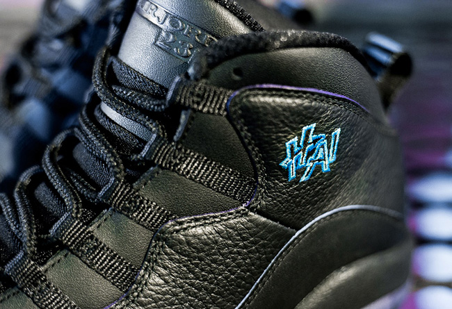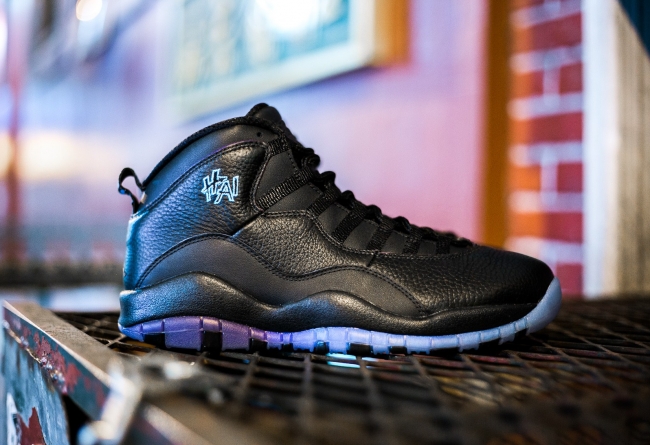 这双 Air Jordan 10 “Shanghai” 以黑色的皮革鞋身搭载了蓝紫渐变色外底,鞋帮上的 HAI 刺绣则表明了它的身份。