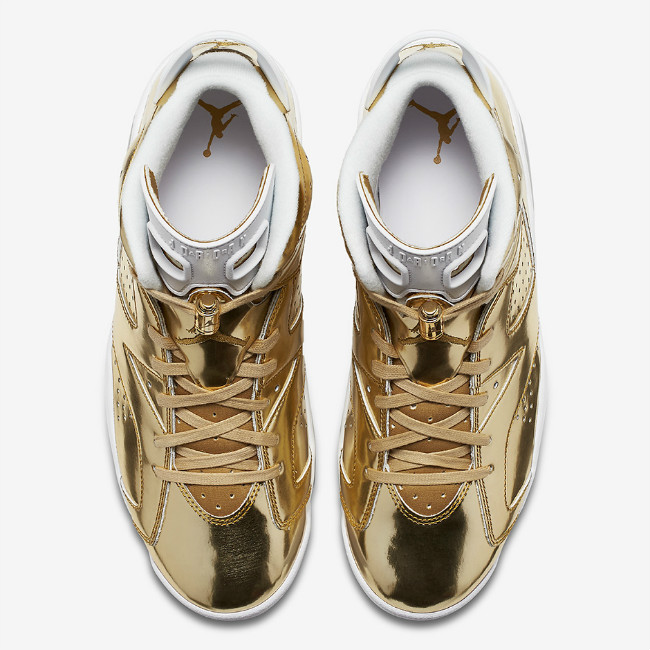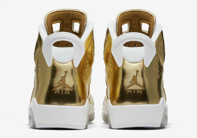 Air Jordan 6 Pinnacle Metallic Gold 是由乔丹的首个总冠军与布莱恩奖杯为启发。鞋身以金属金色为主,并采用白色细节,半透明水晶外底也搭配有金粉。金色 Jumpman 吊牌更是与主题相对,成为亮点之一。